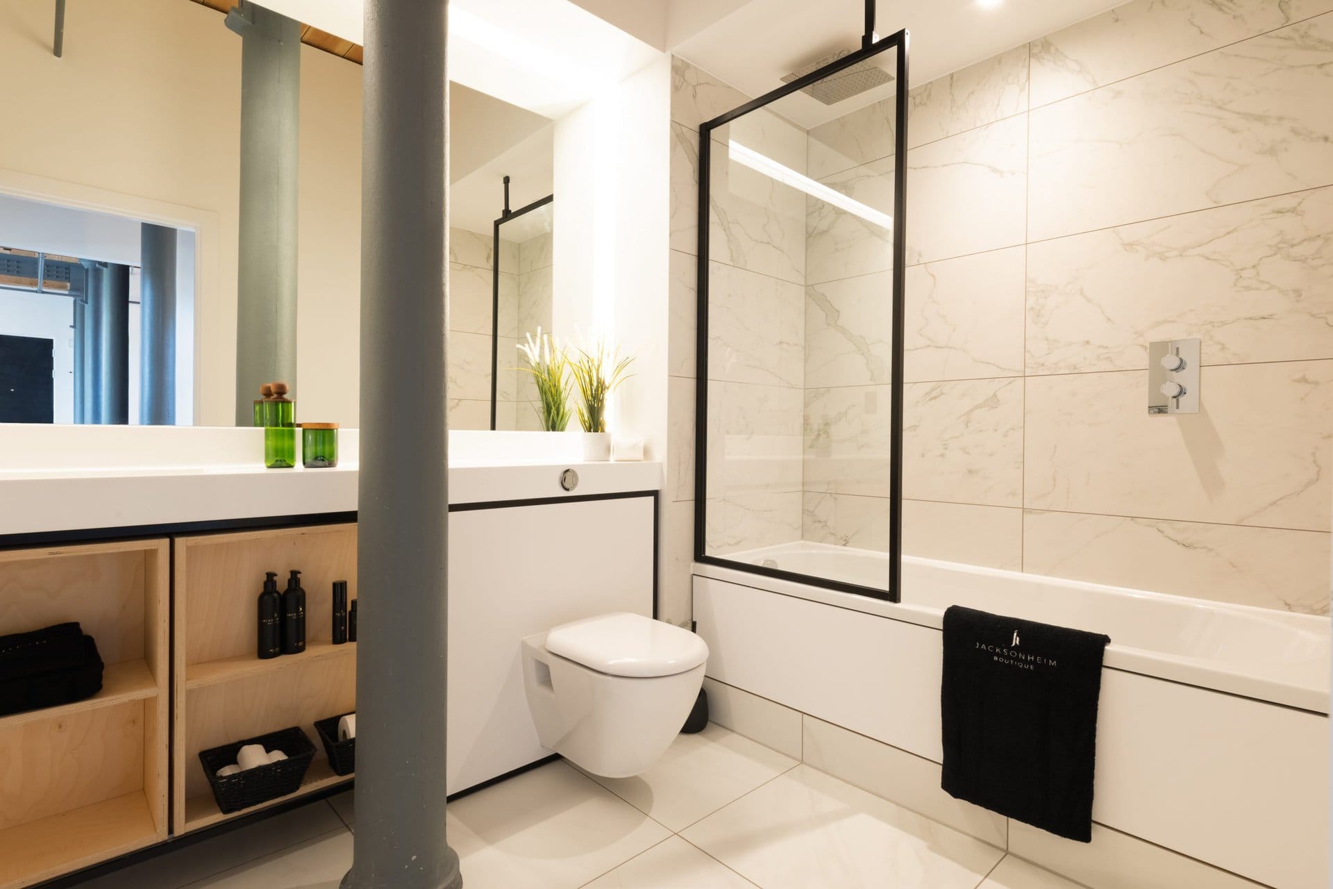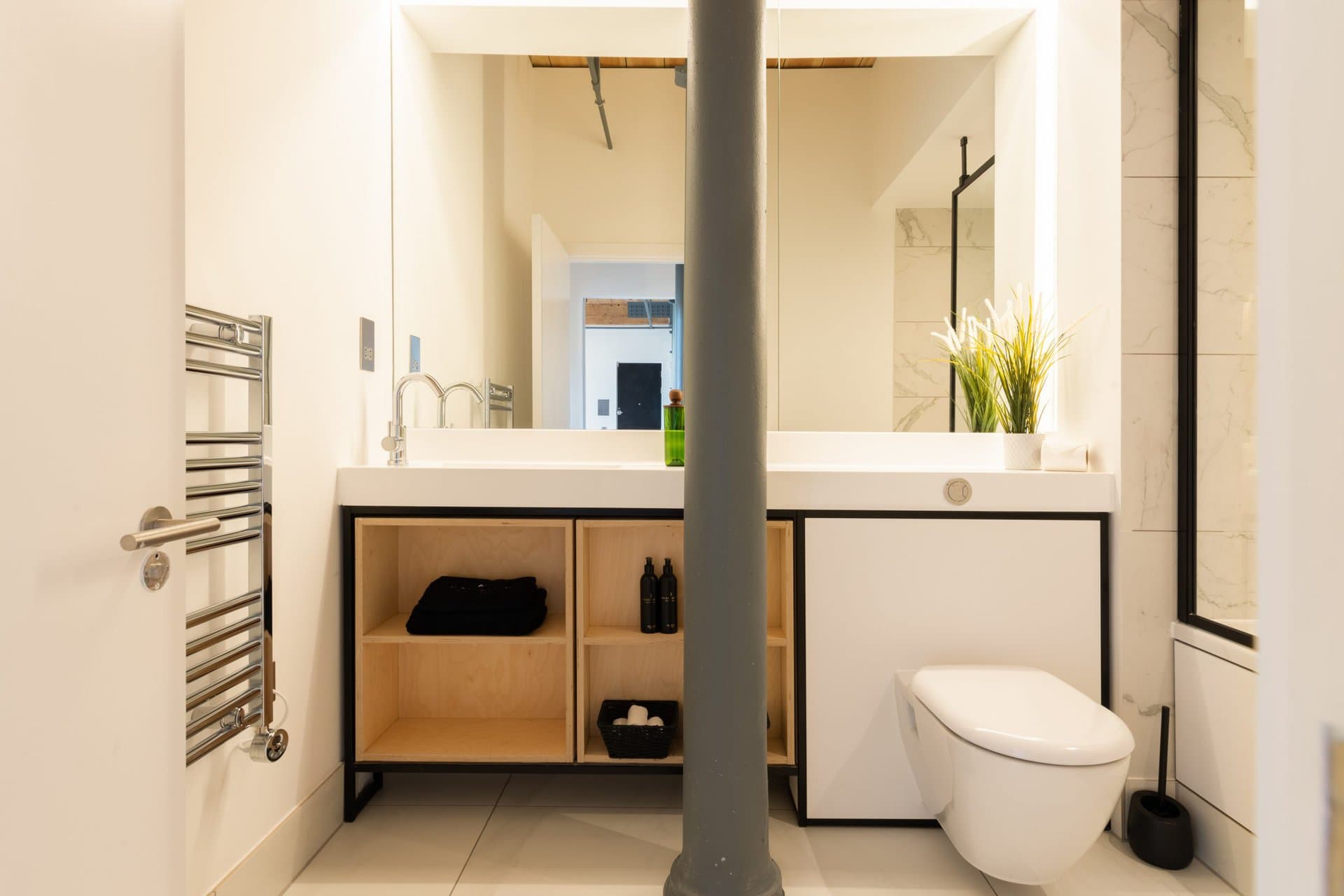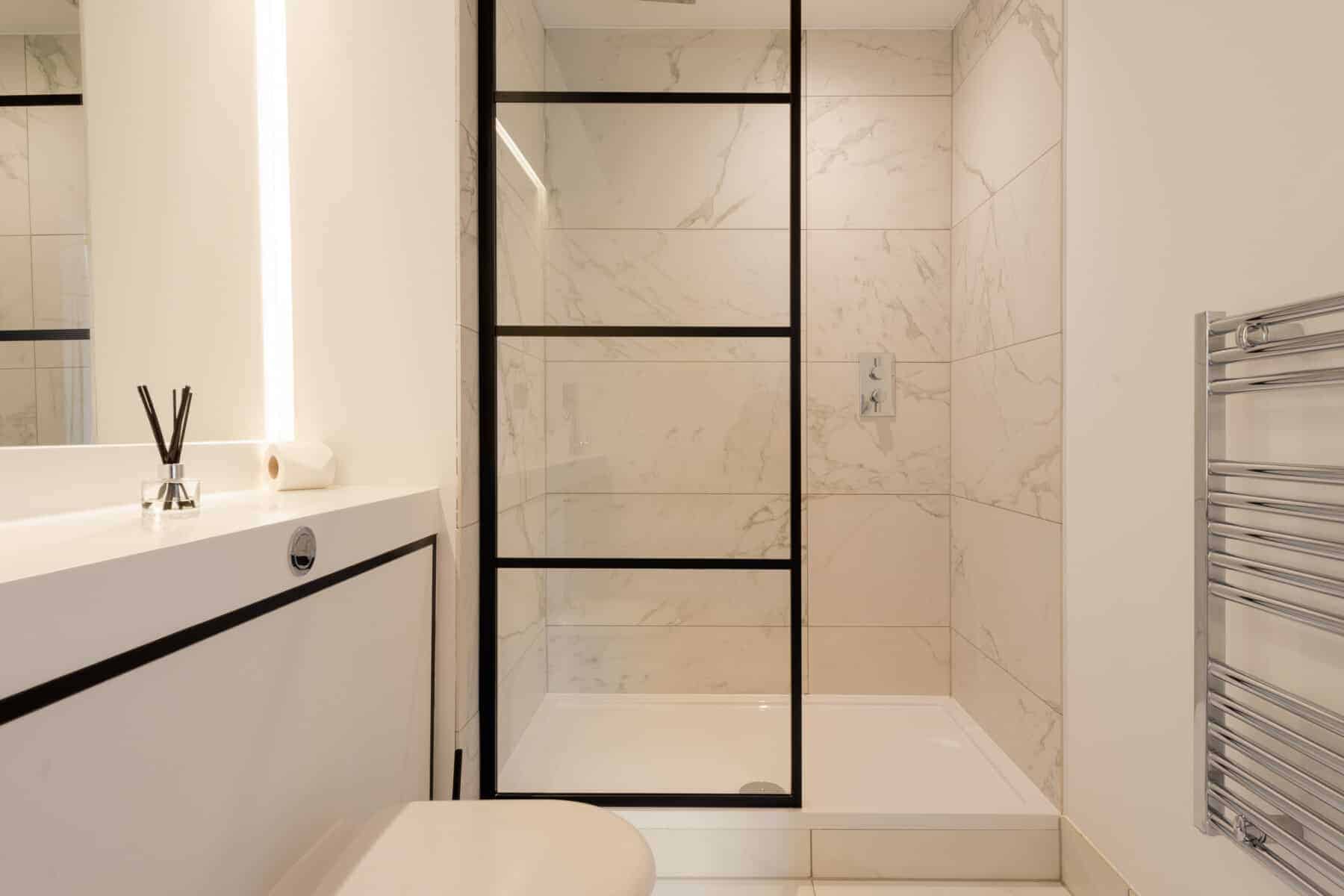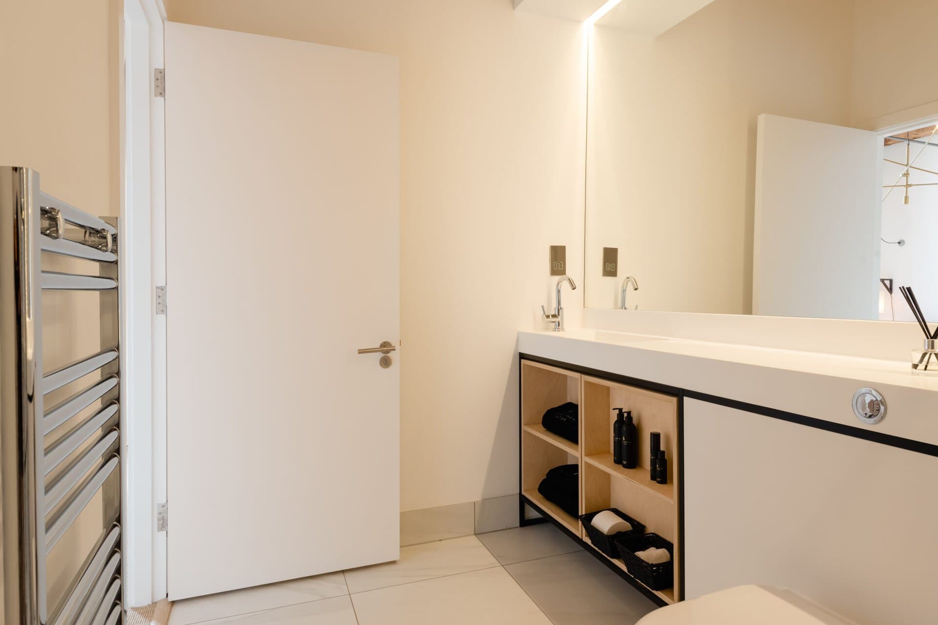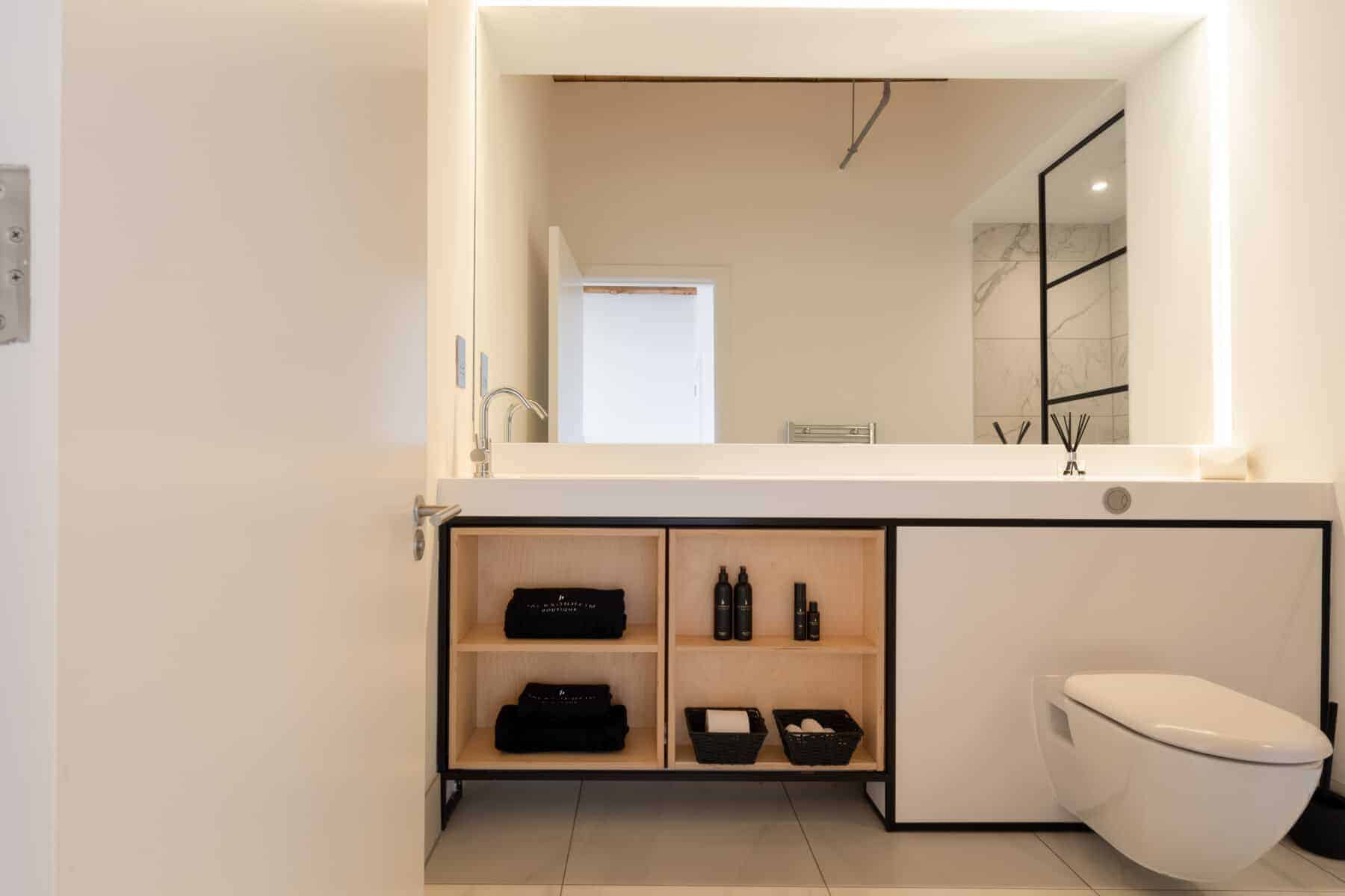 The bathrooms balance simplicity with luxury.Boasting a large walk in shower  in the upstairs en suite and a spacious tub in the downstairs both bathrooms have mirrored cabinets that help bounce light around the rooms.Â
