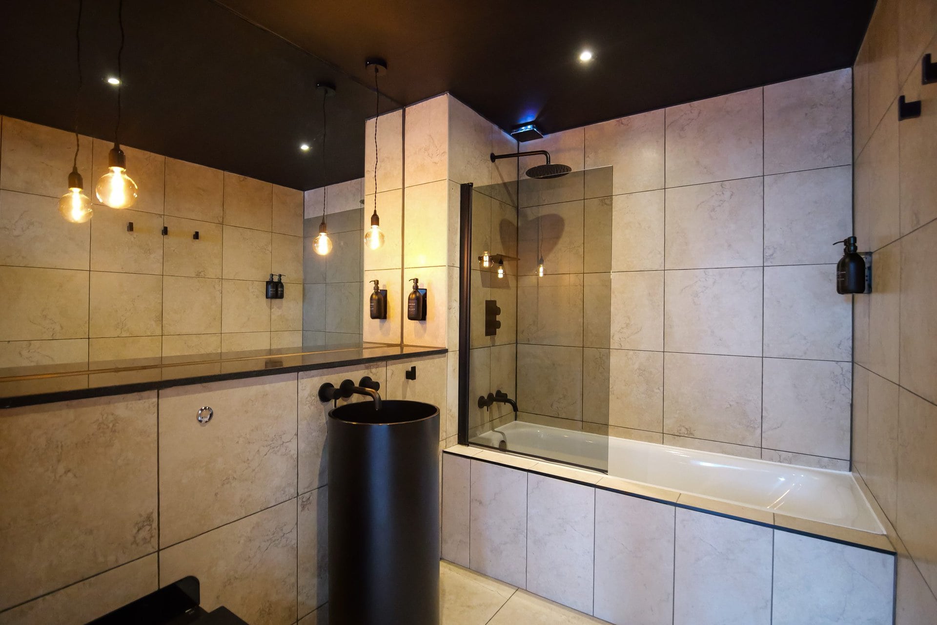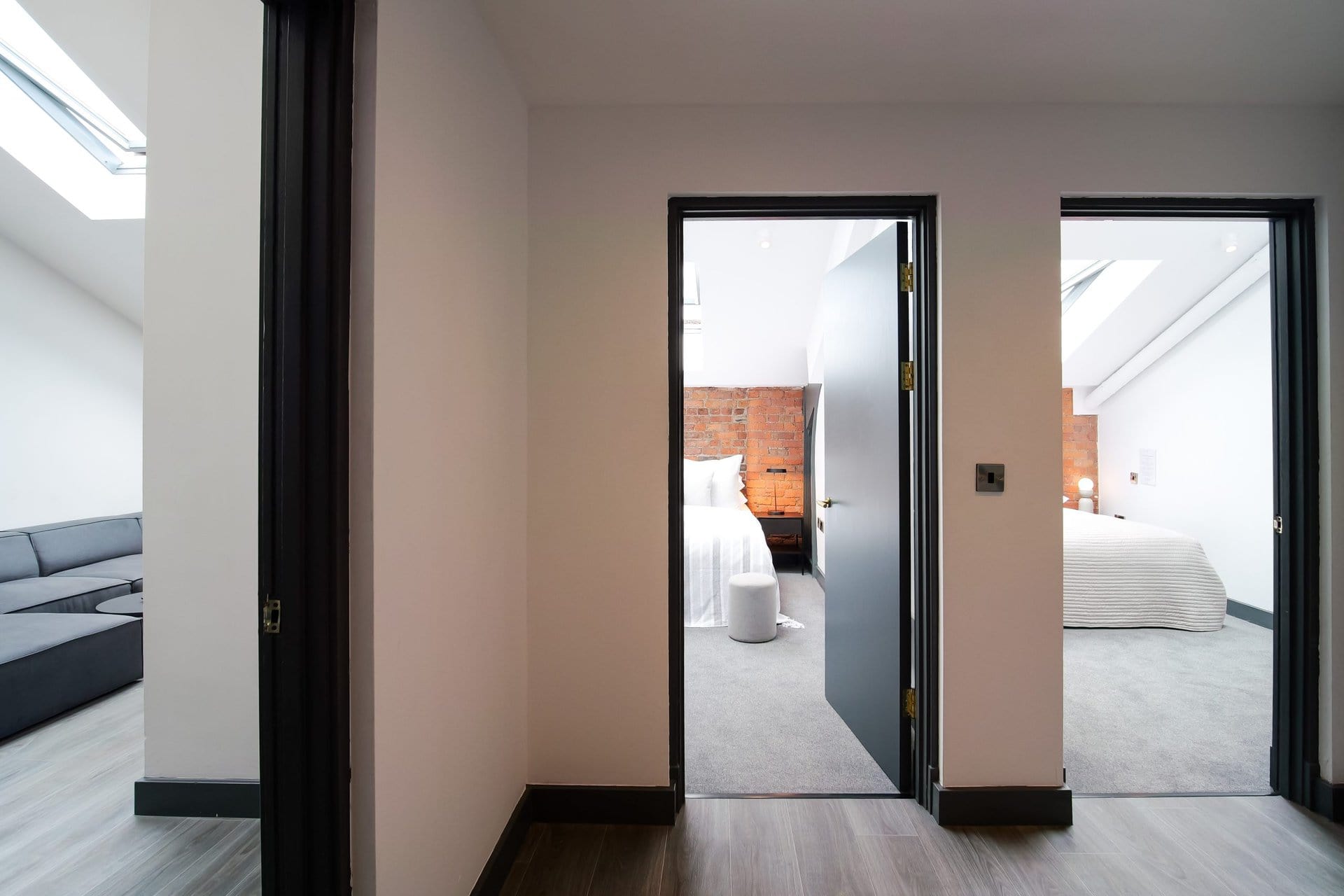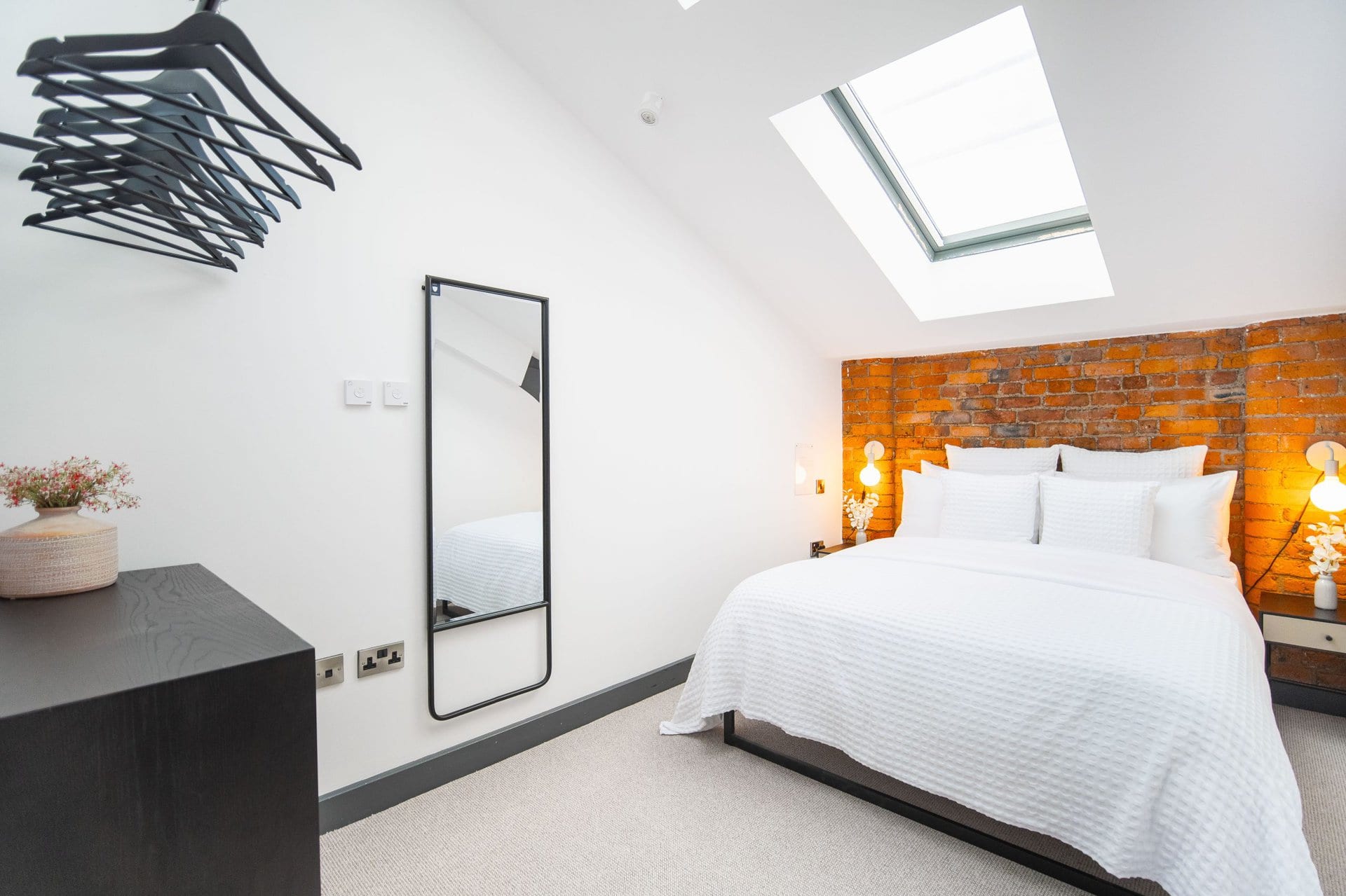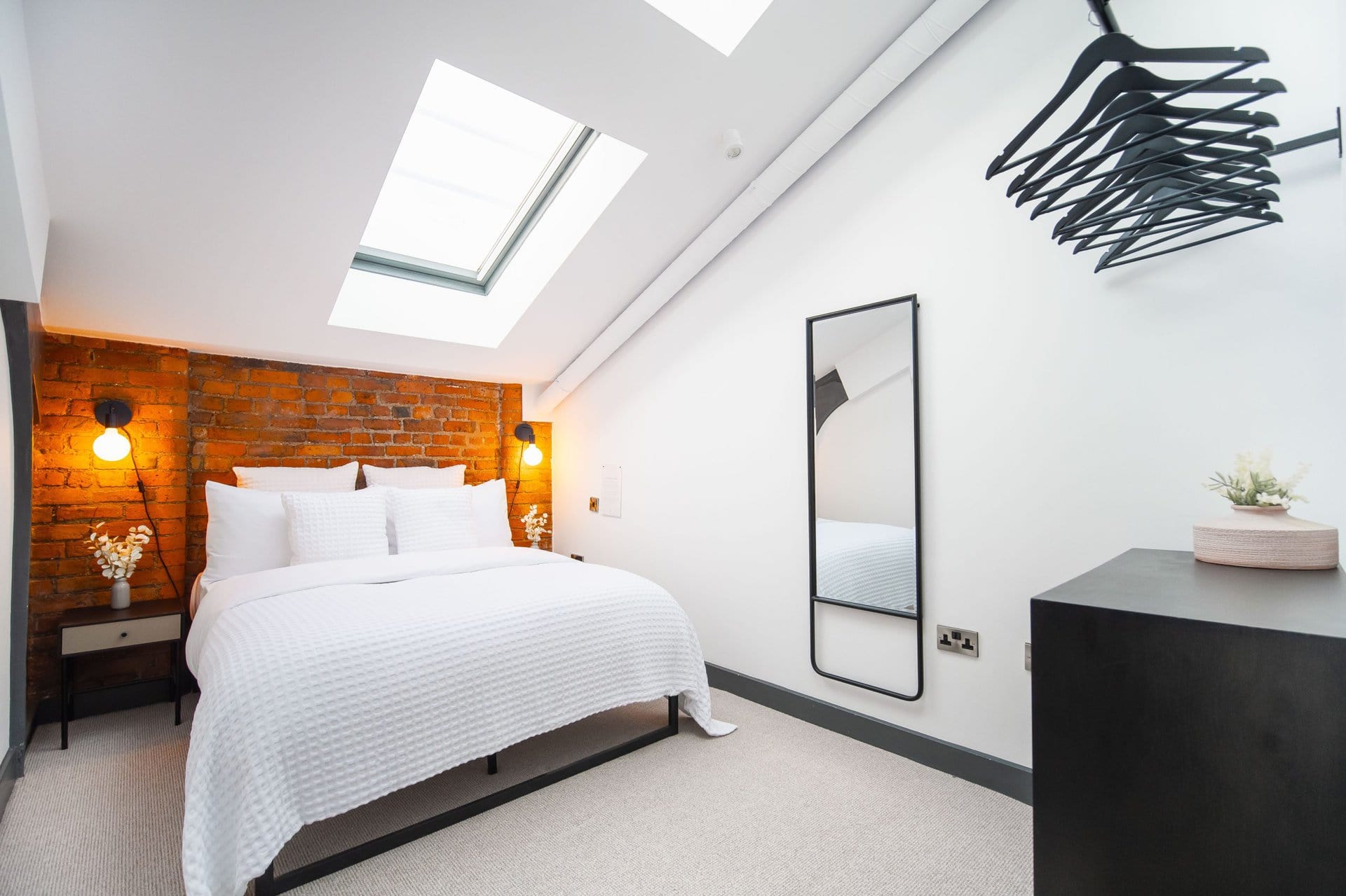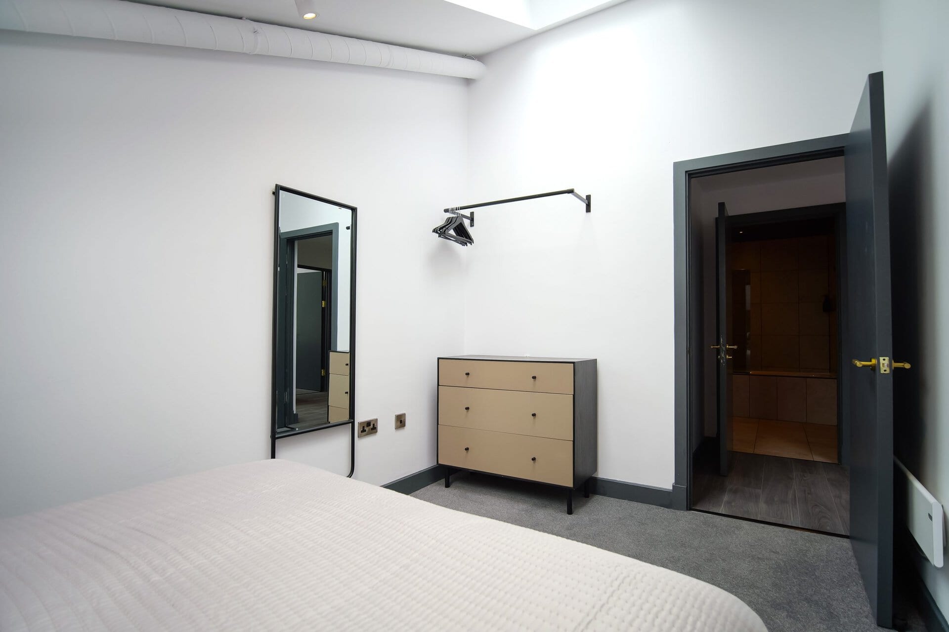 The bathrooms balance simplicity with luxury.Boasting a large walk in shower  in the upstairs en suite and a spacious tub in the downstairs both bathrooms have mirrored cabinets that help bounce light around the rooms.Â