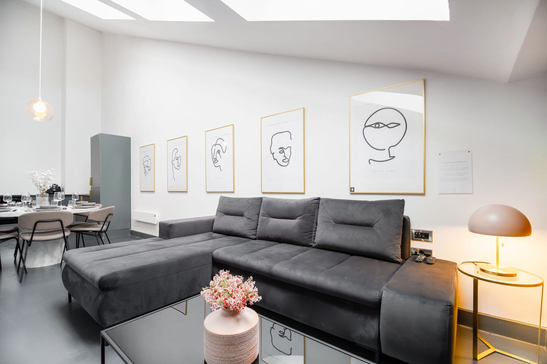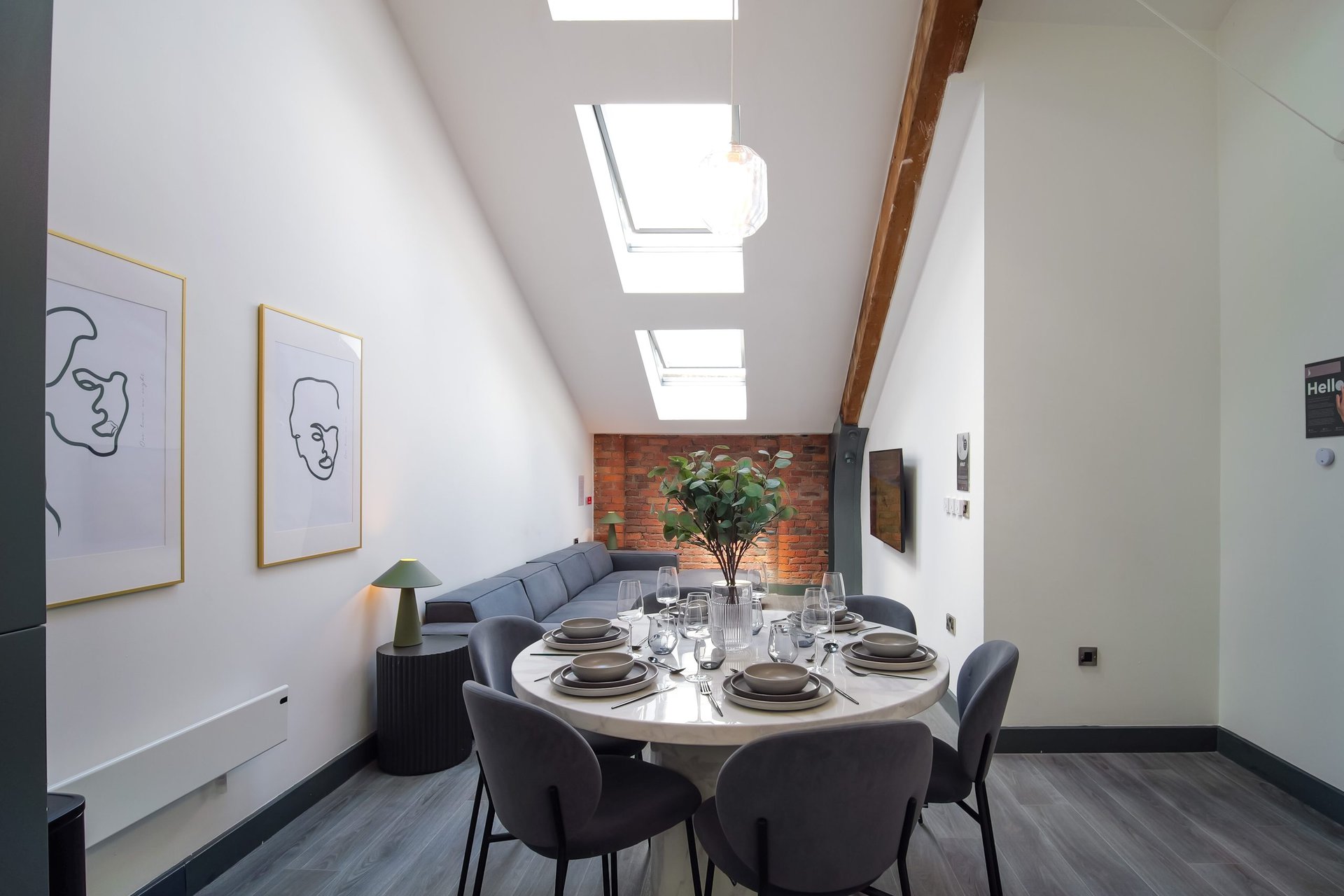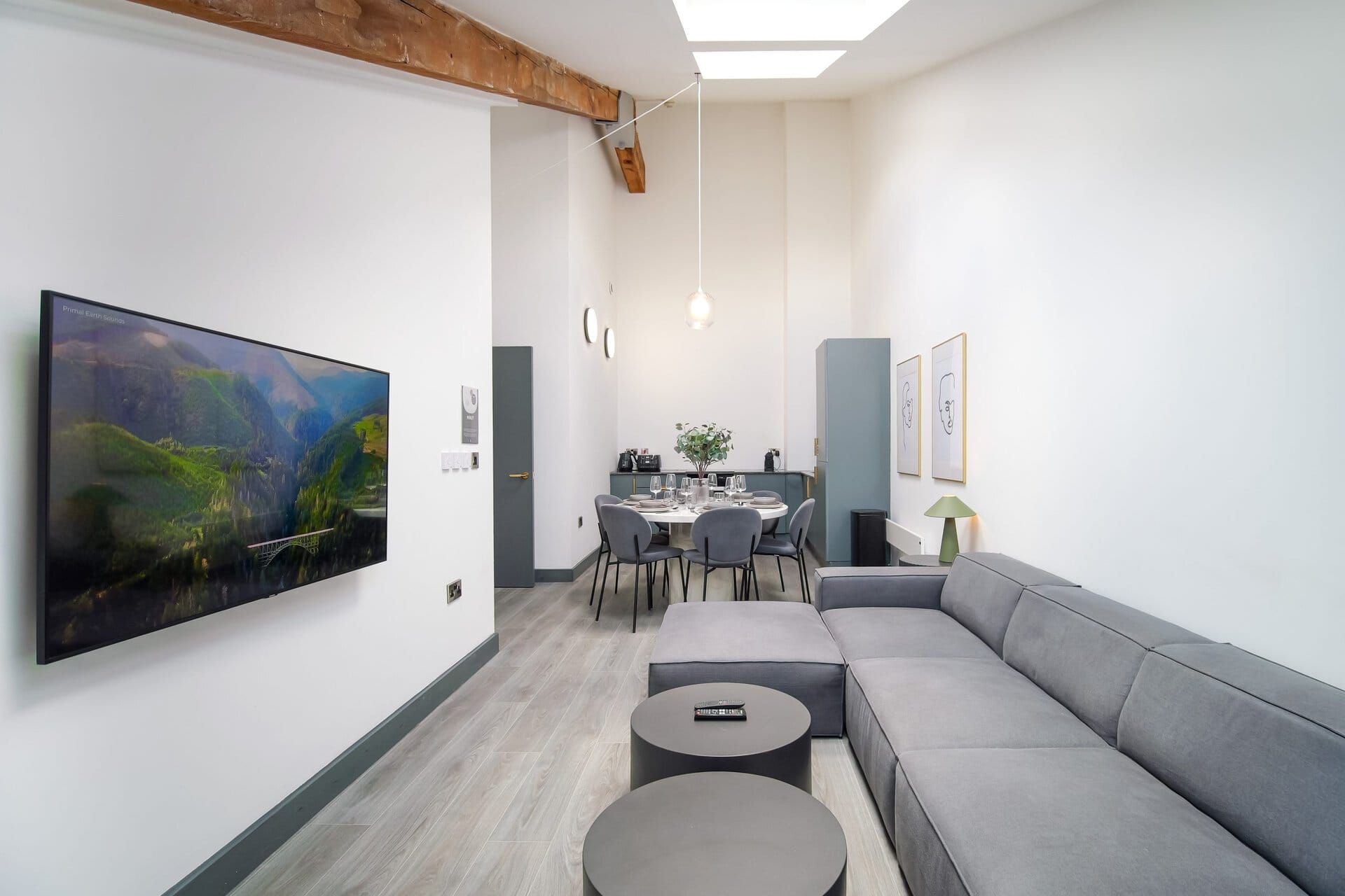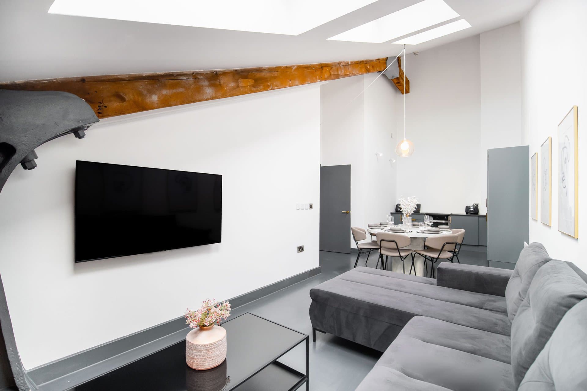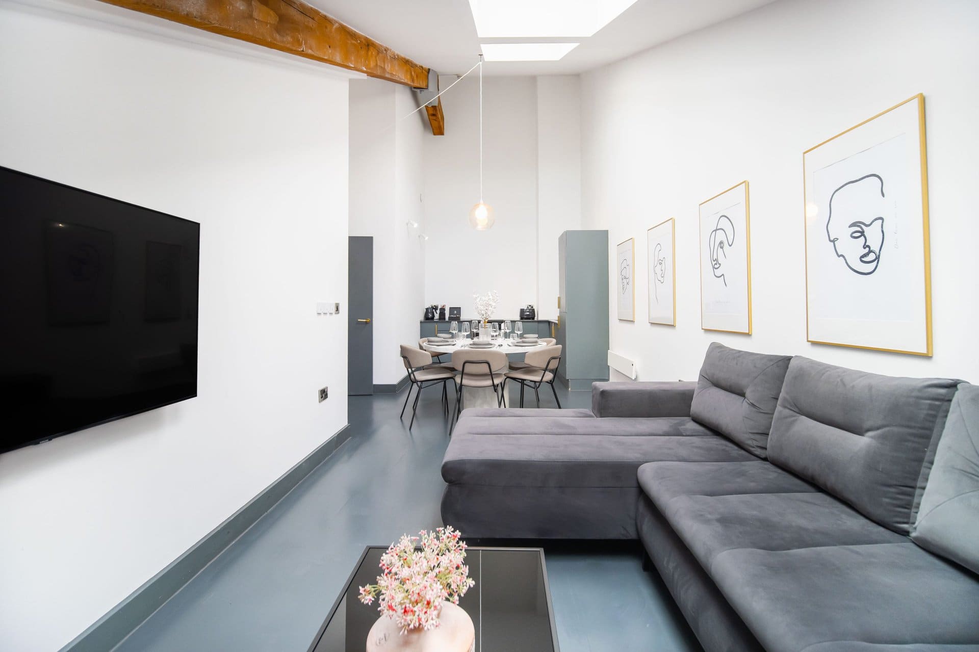 The living space boasts impressively high ceilings, an extremely comfortable sofa and a 50 inch Sky Glass TV with all streaming platforms. This is the ideal space to relax and wind down.Â
