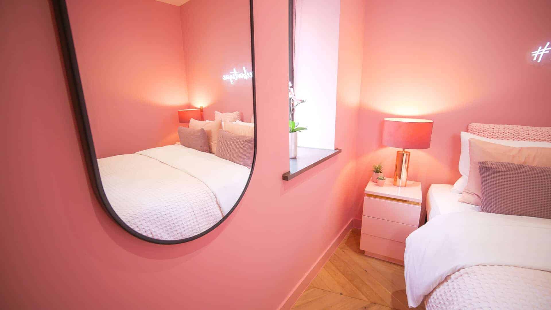 The bathrooms balance simplicity with luxury.Boasting a large walk in shower  in the upstairs en suite and a spacious tub in the downstairs both bathrooms have mirrored cabinets that help bounce light around the rooms.Â