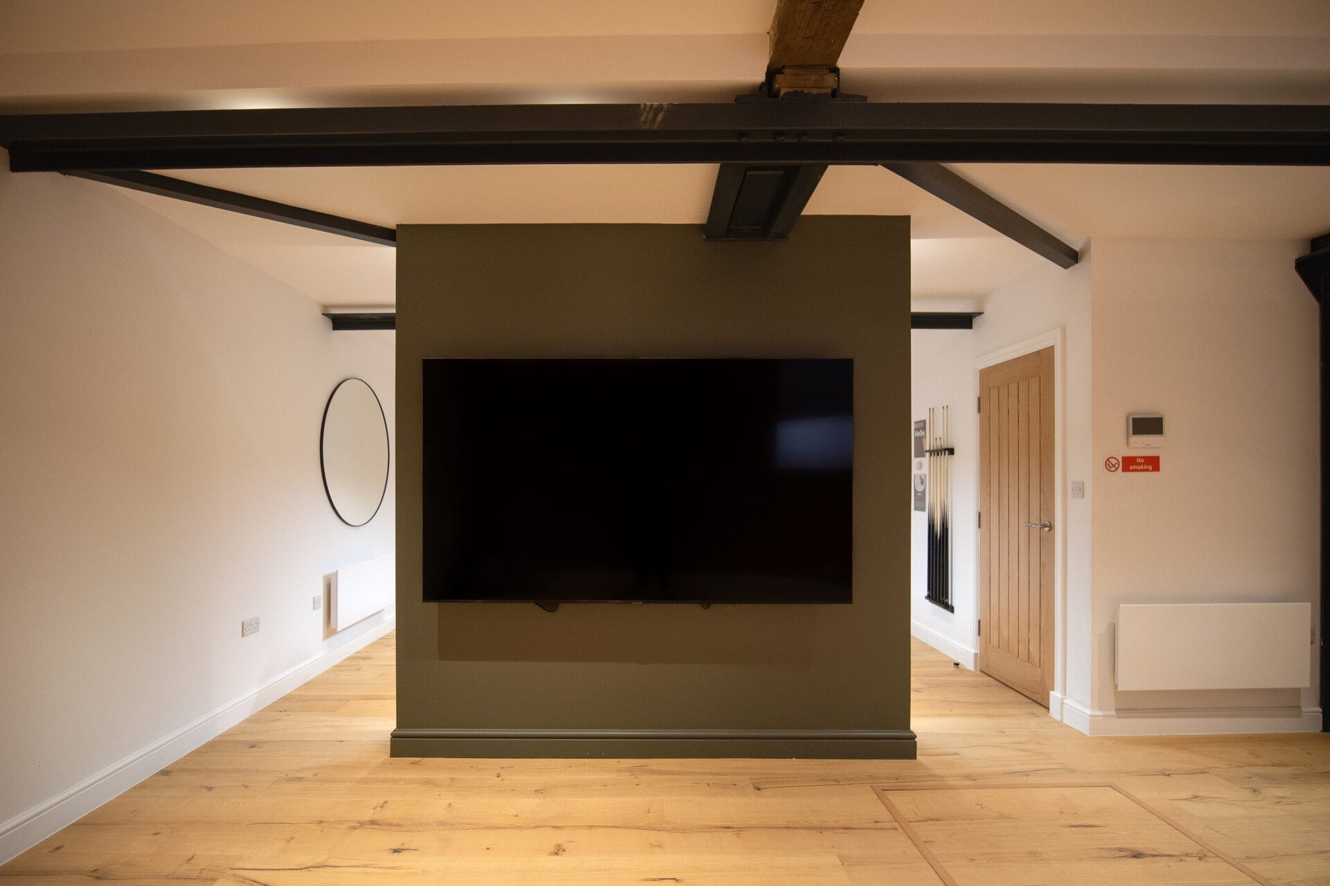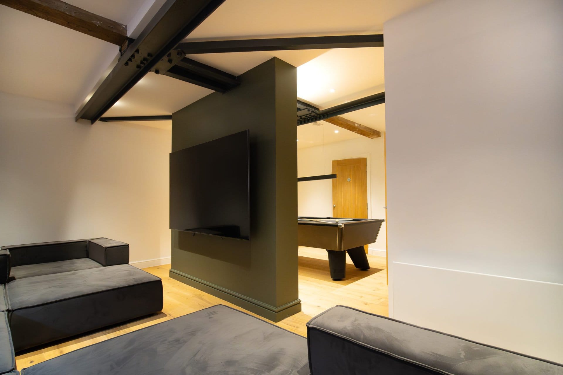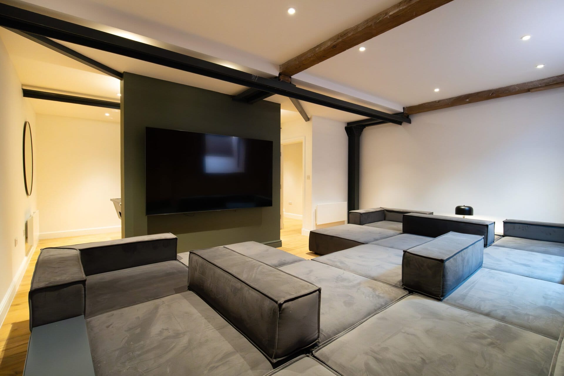 The living space boasts impressively high ceilings, an extremely comfortable sofa and a 50 inch Sky Glass TV with all streaming platforms. This is the ideal space to relax and wind down.Â