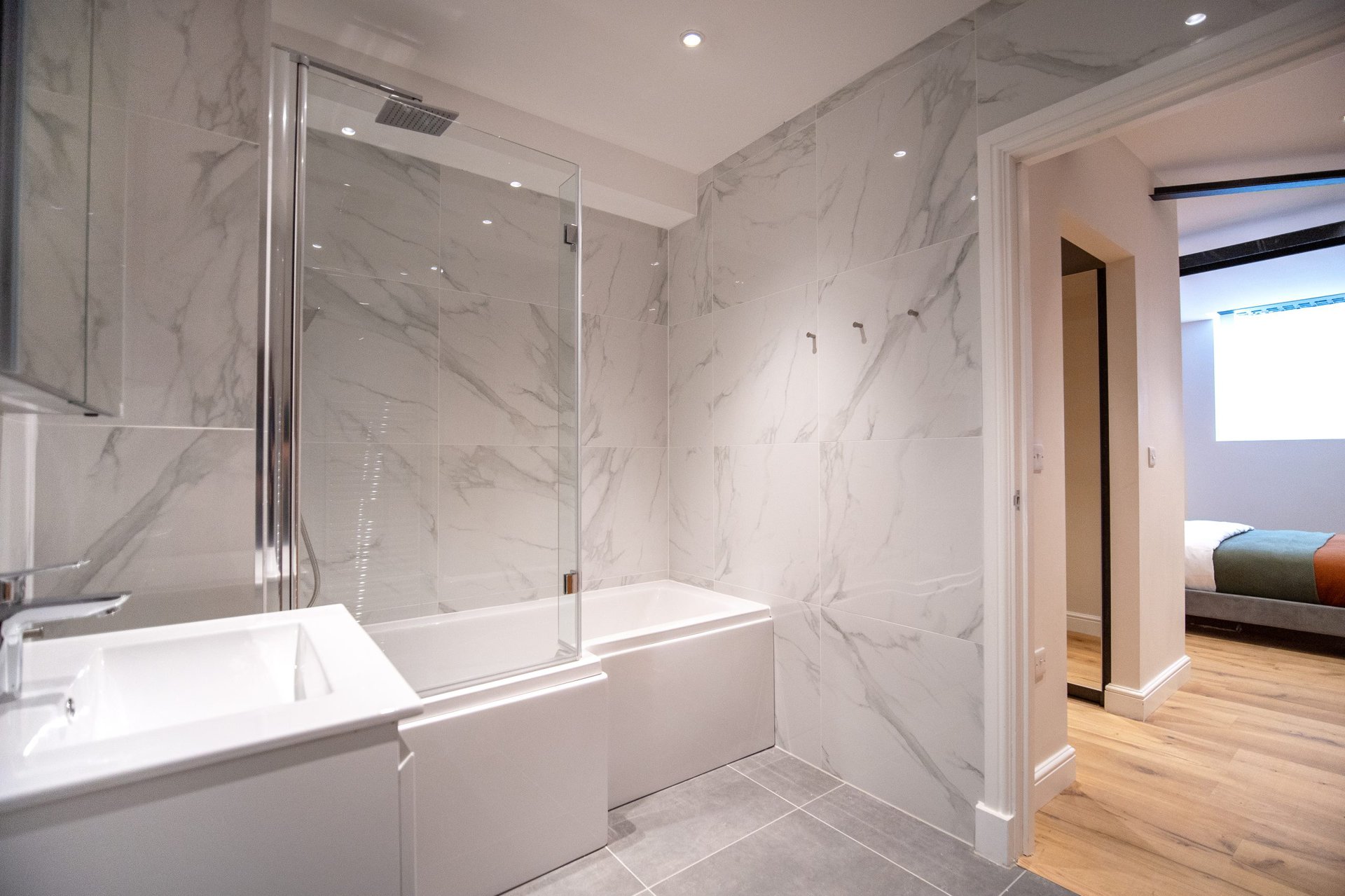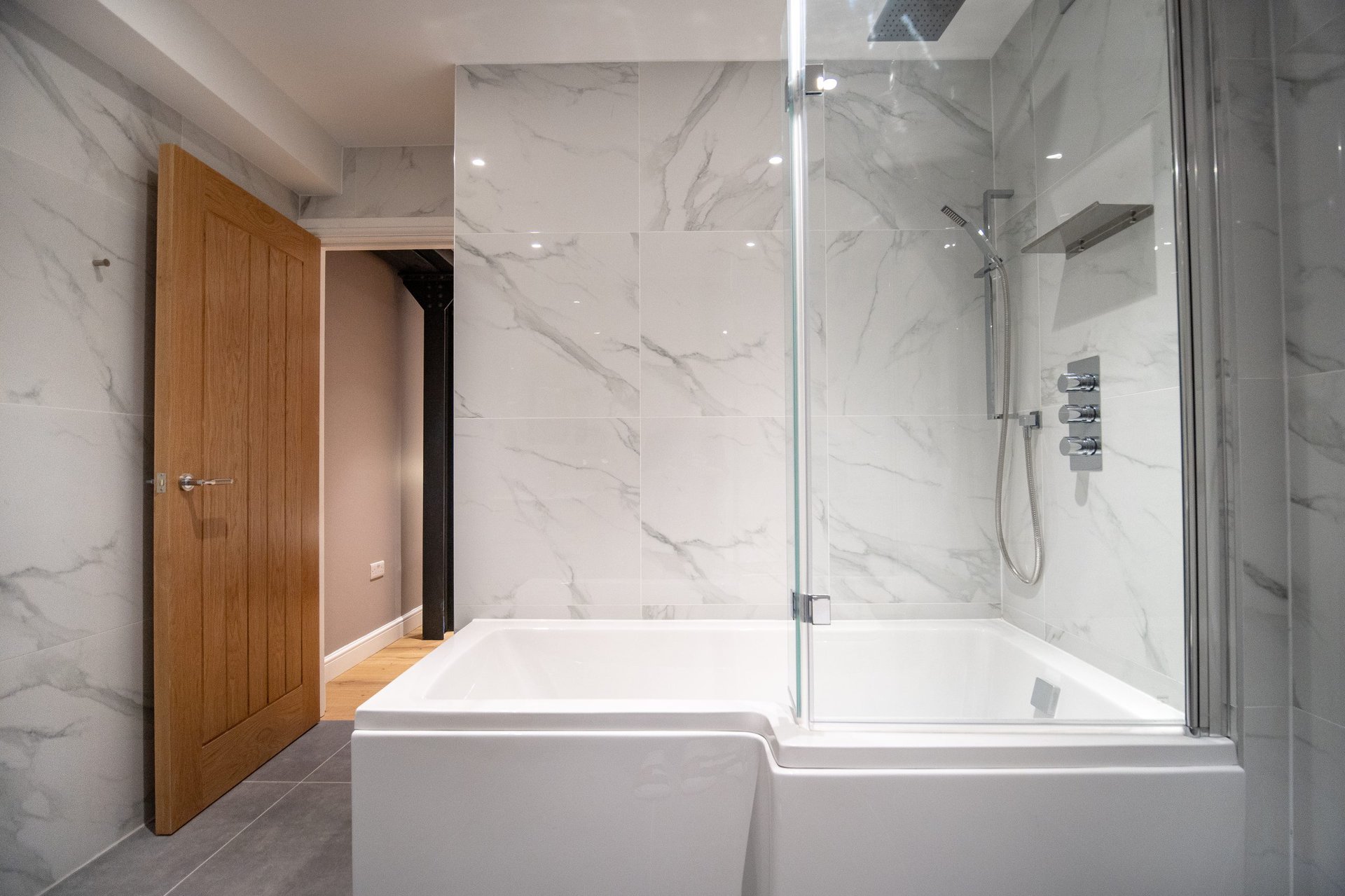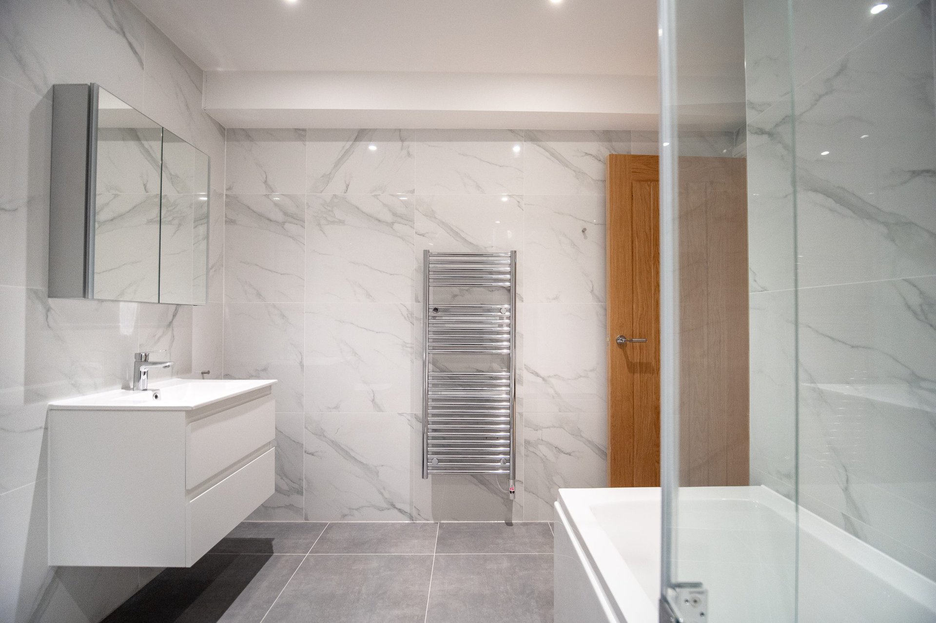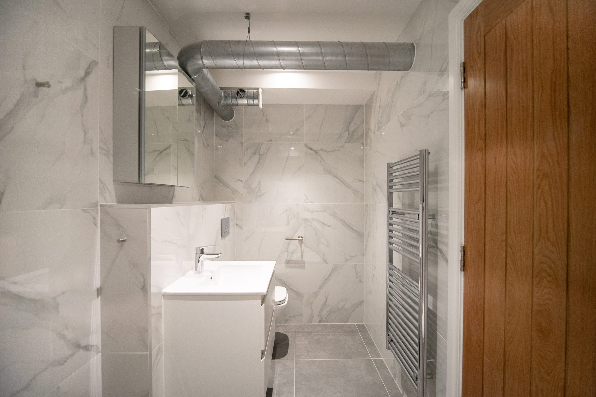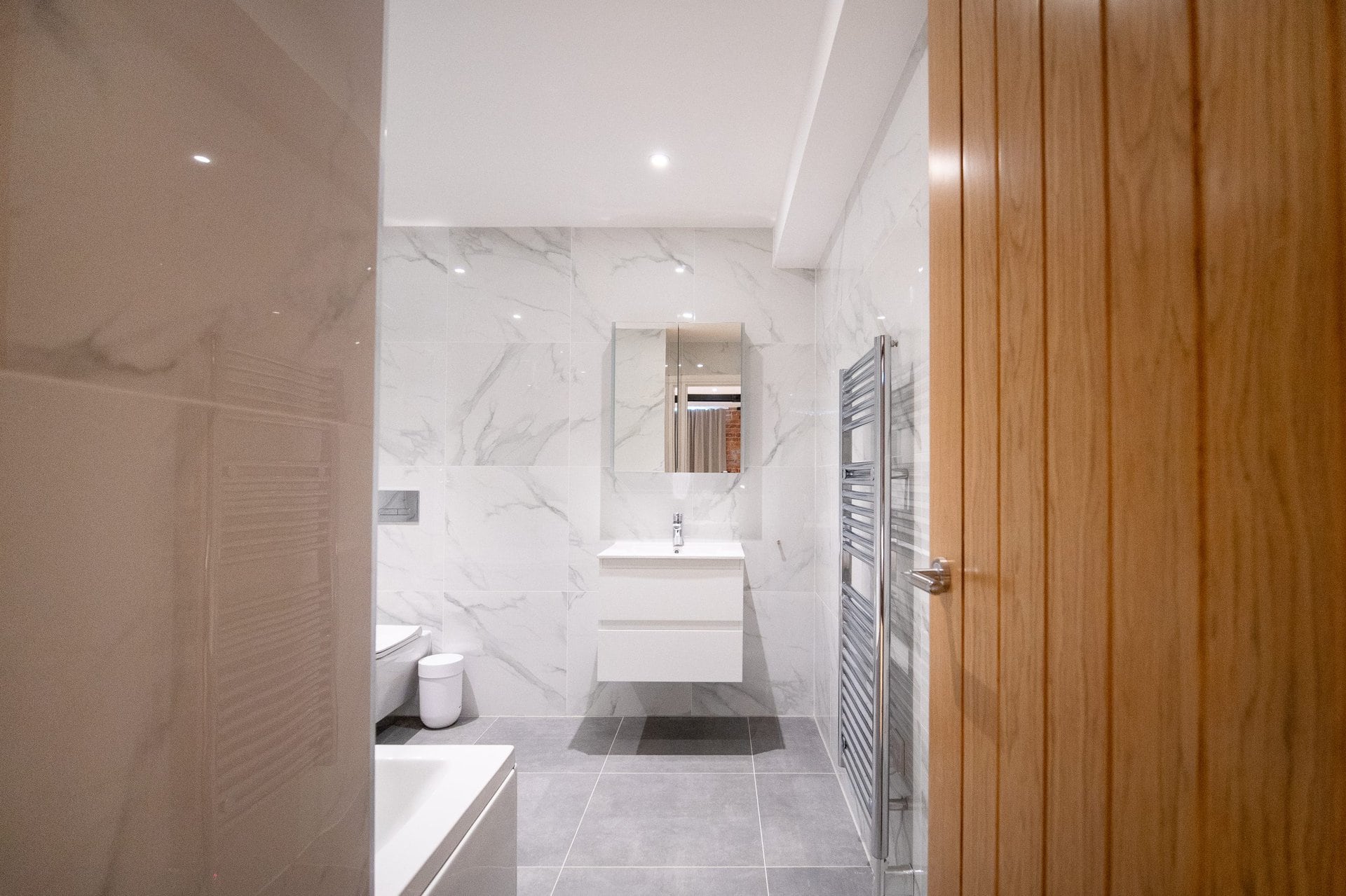 The bathrooms balance simplicity with luxury.Boasting a large walk in shower  in the upstairs en suite and a spacious tub in the downstairs both bathrooms have mirrored cabinets that help bounce light around the rooms.Â