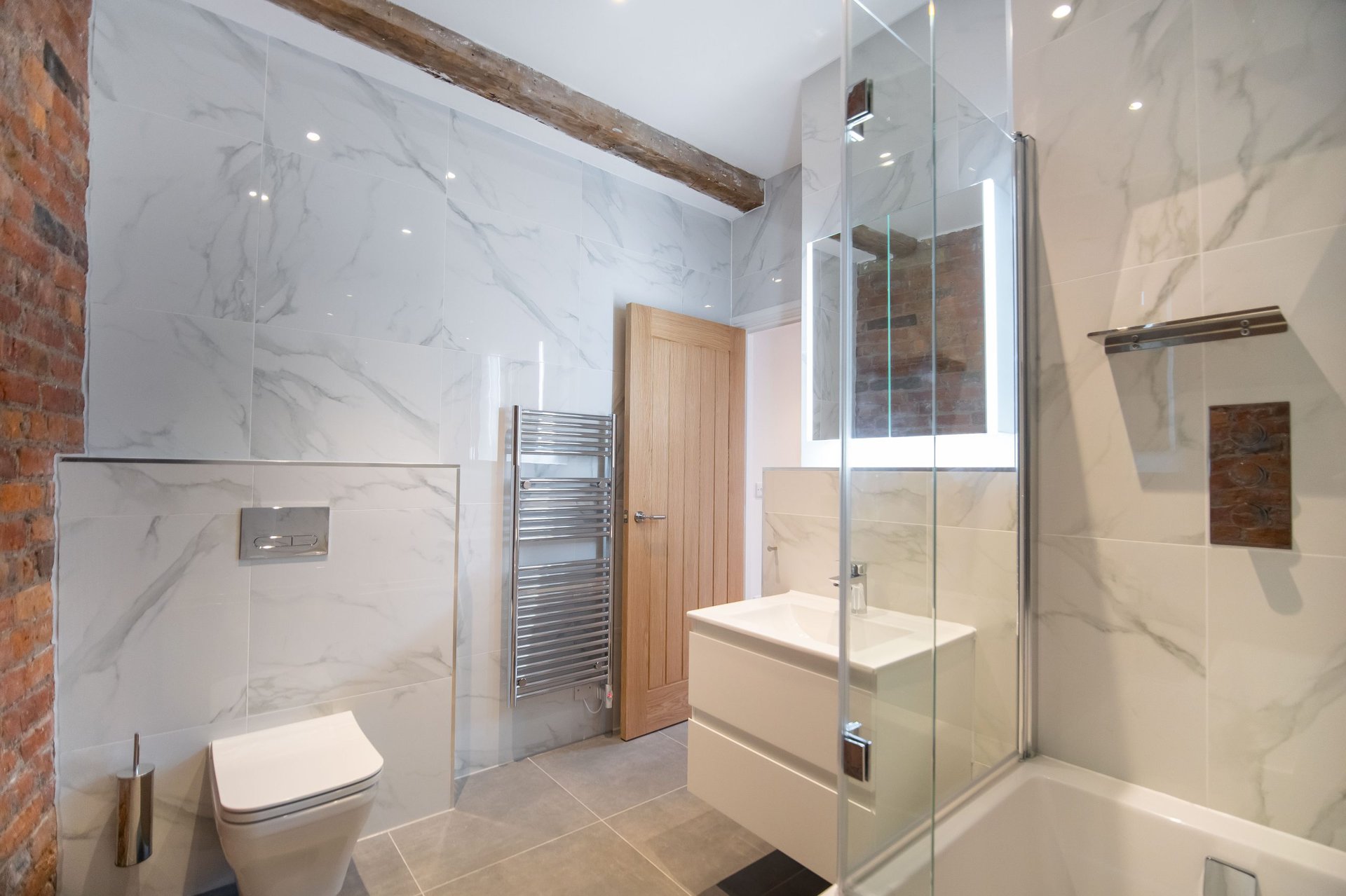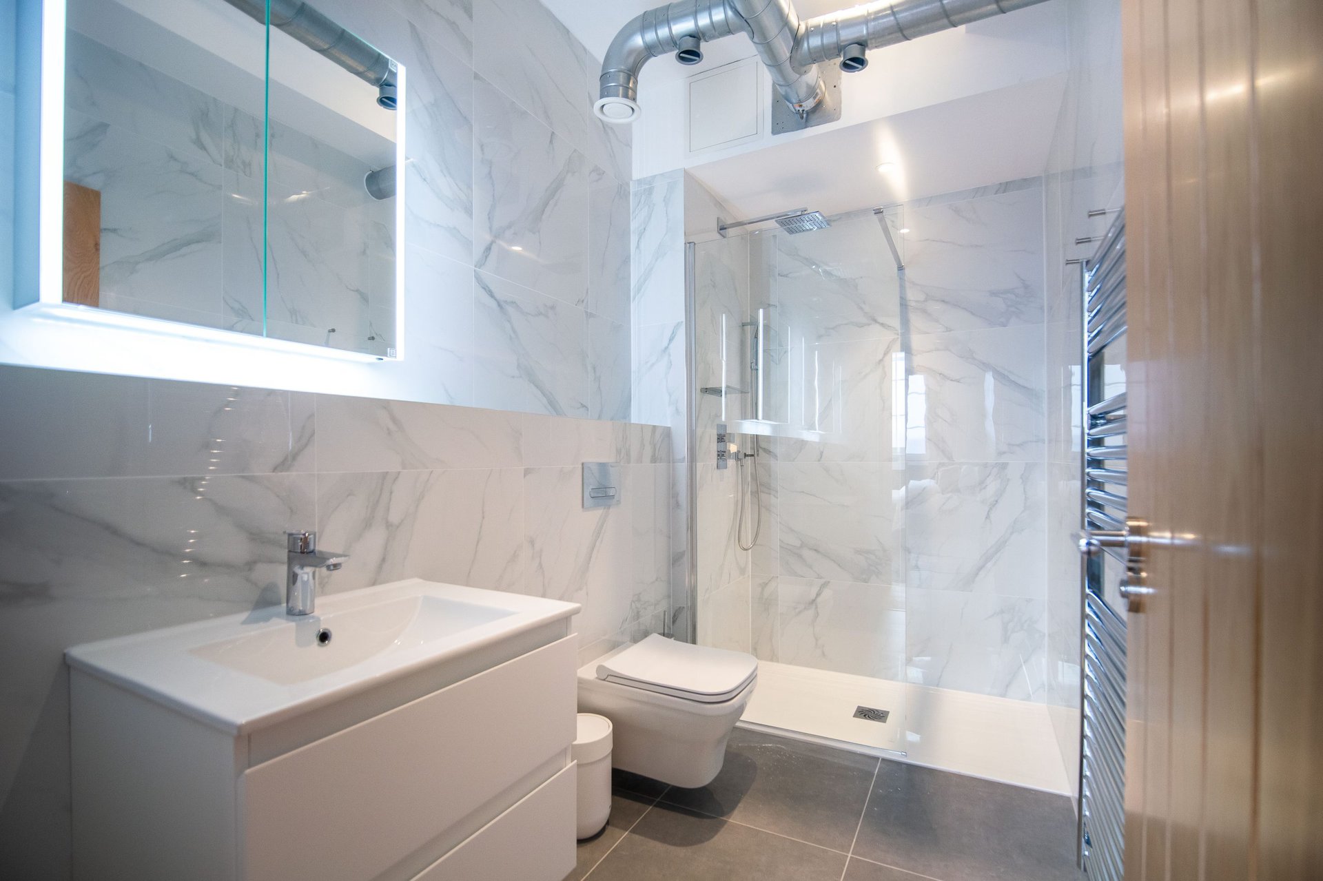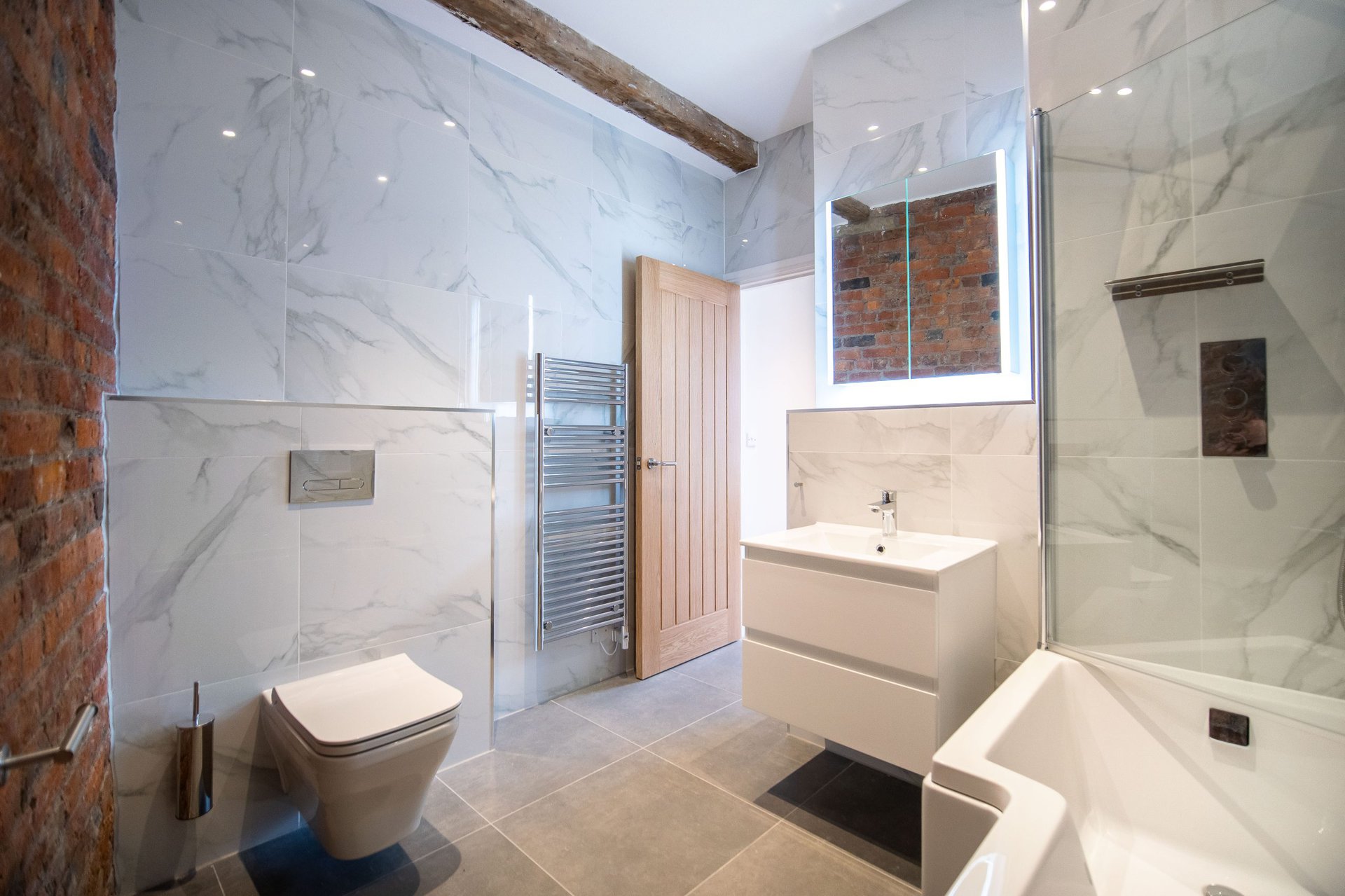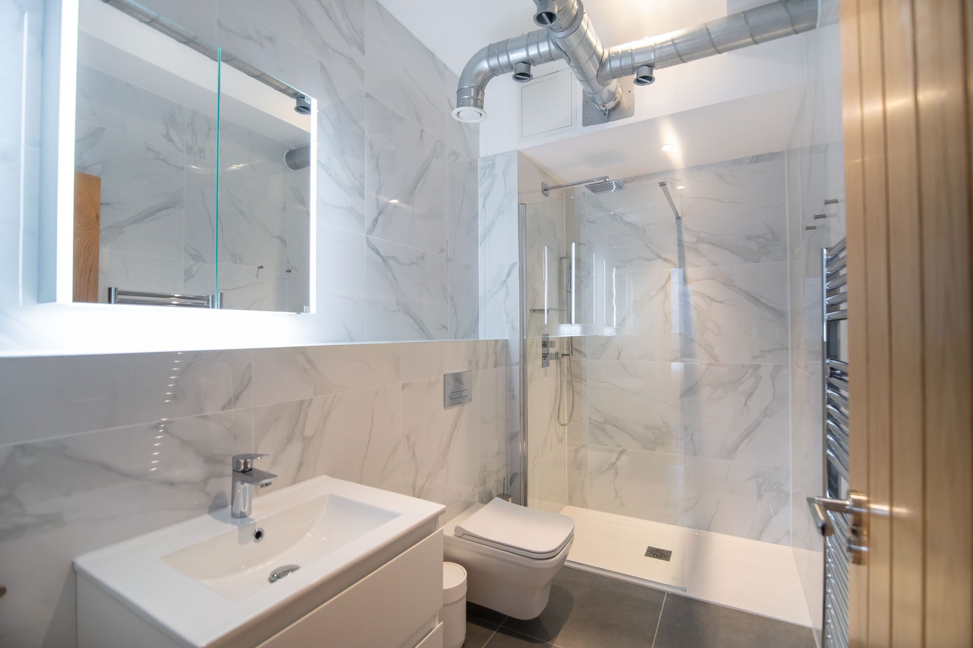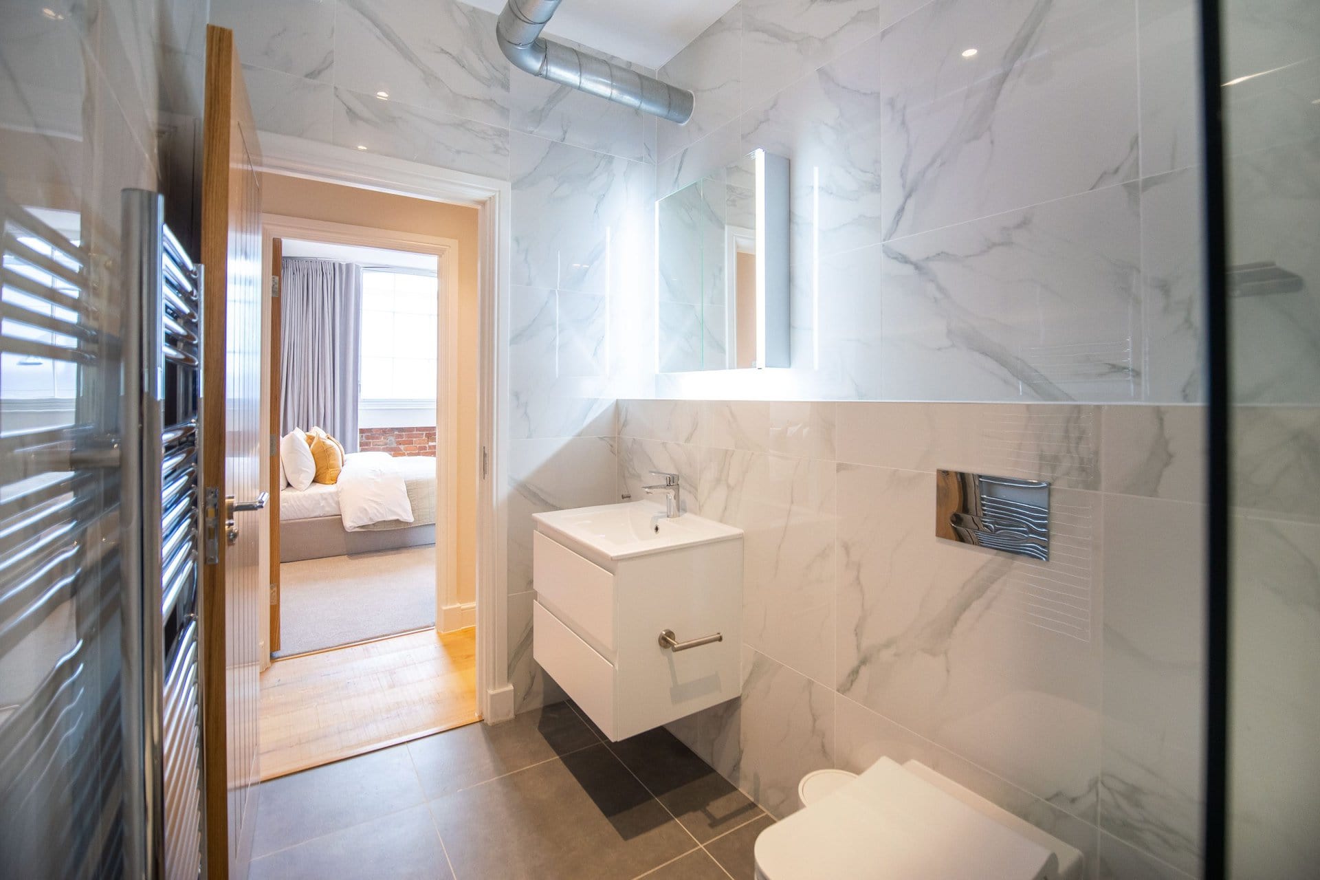 The bathrooms balance simplicity with luxury.Boasting a large walk in shower  in the upstairs en suite and a spacious tub in the downstairs both bathrooms have mirrored cabinets that help bounce light around the rooms.Â