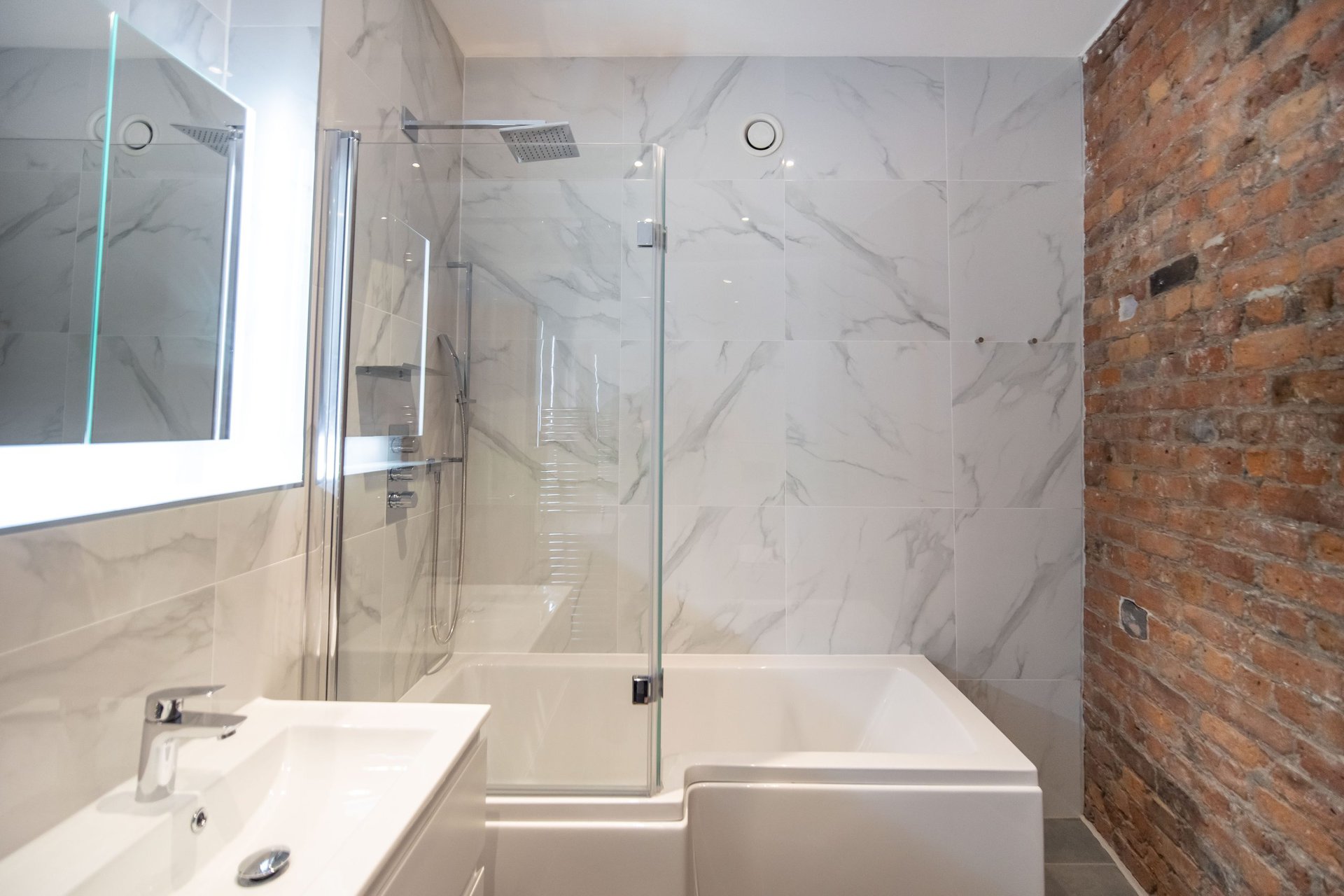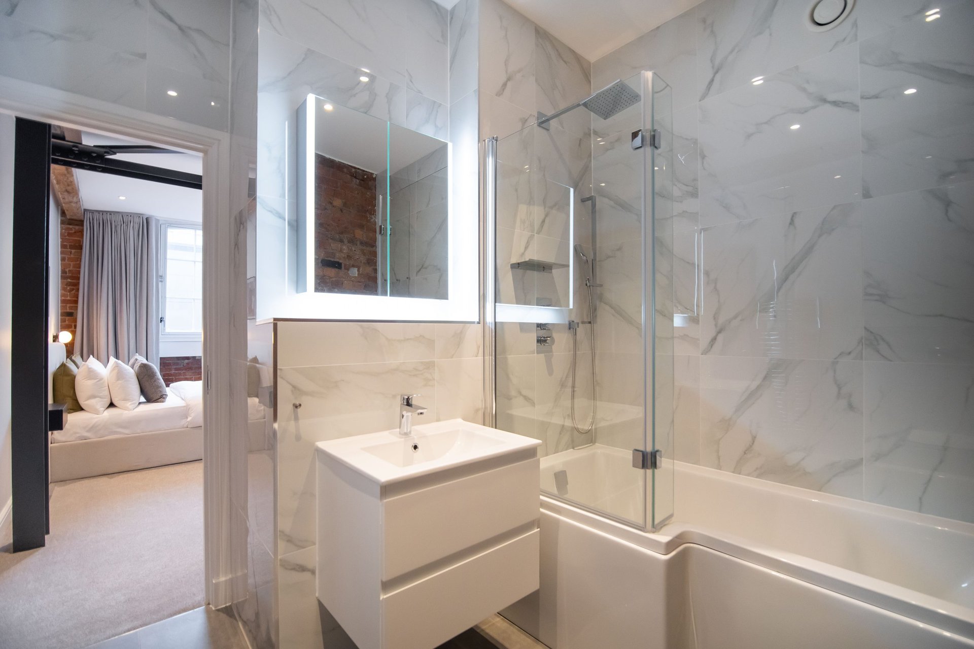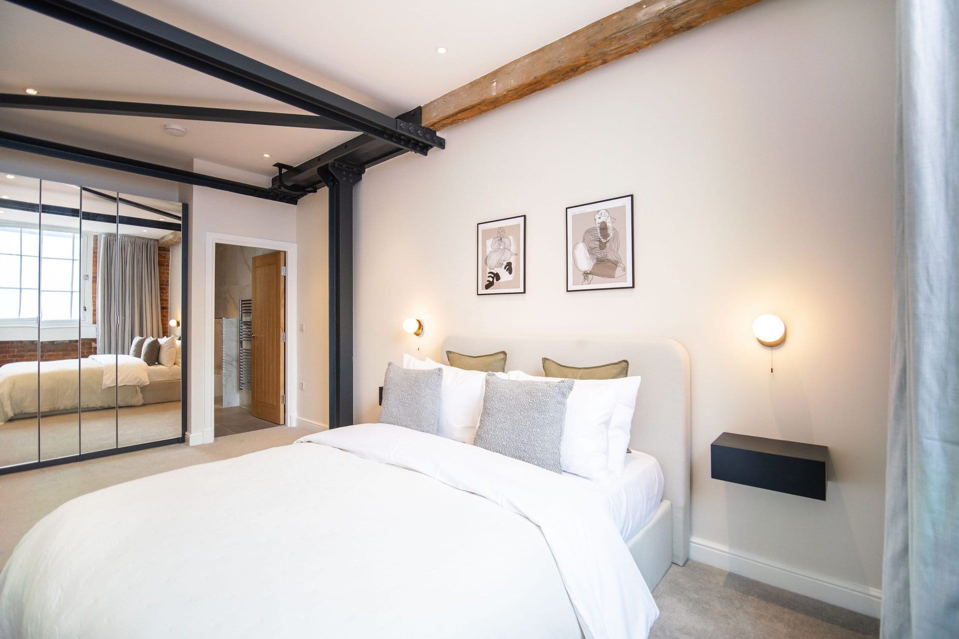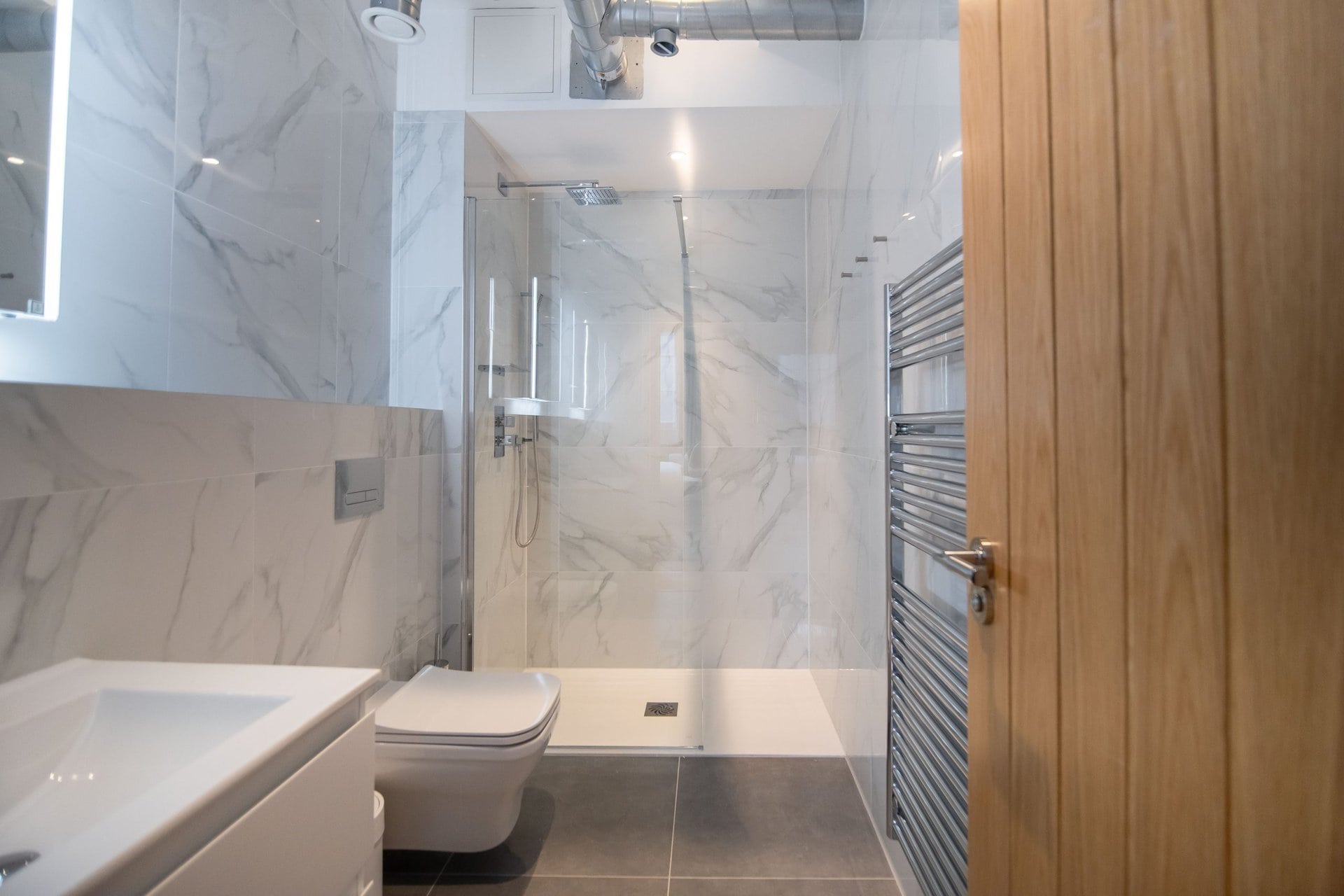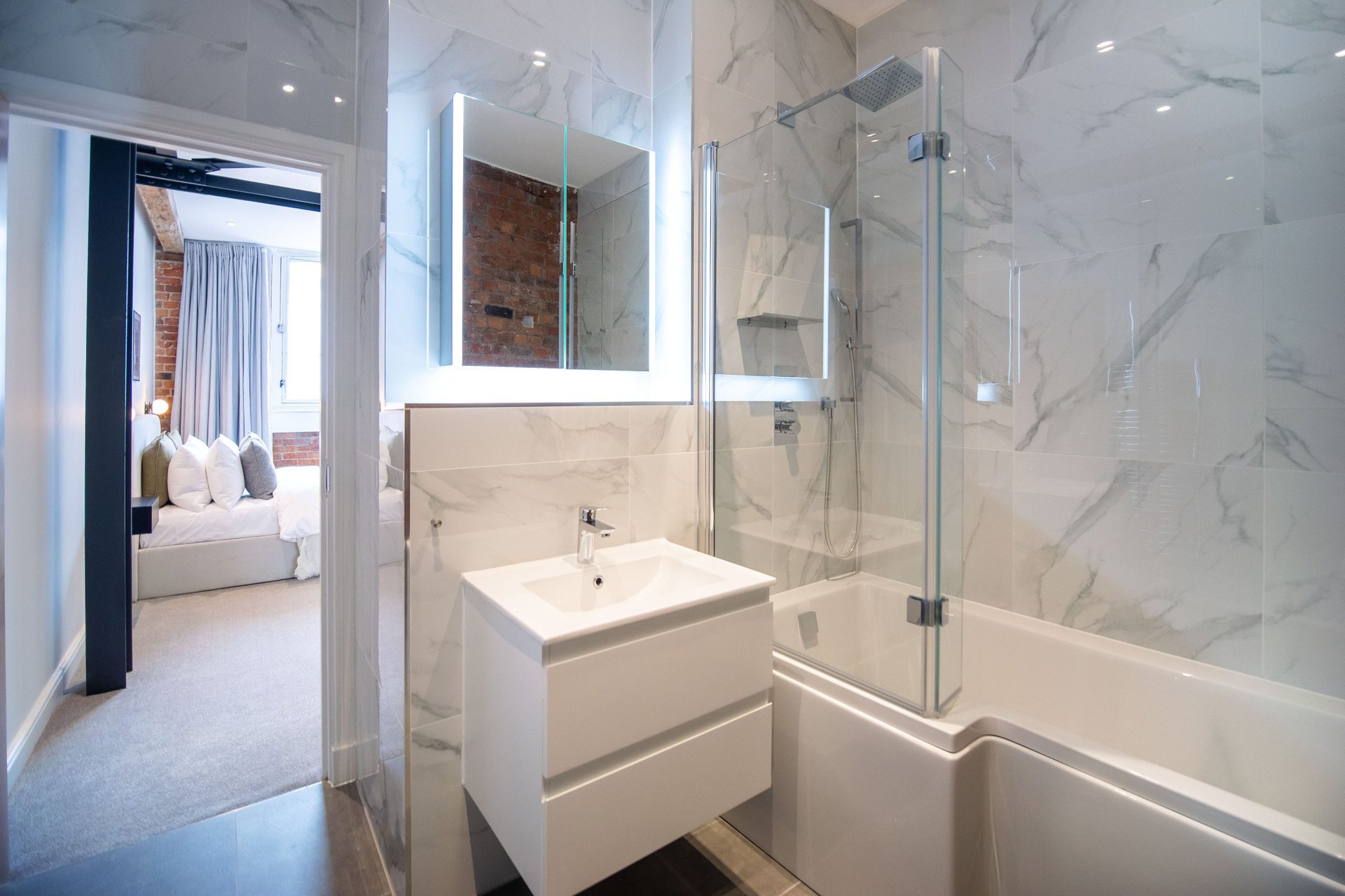 The bathrooms balance simplicity with luxury.Boasting a large walk in shower  in the upstairs en suite and a spacious tub in the downstairs both bathrooms have mirrored cabinets that help bounce light around the rooms.Â