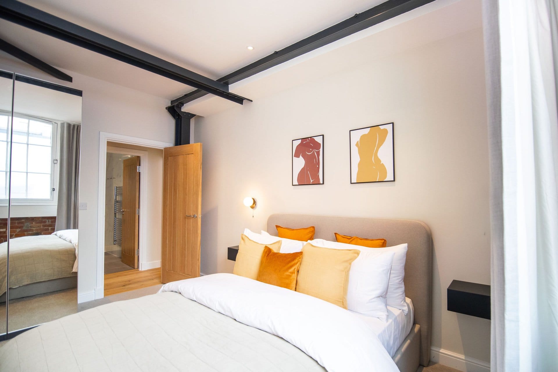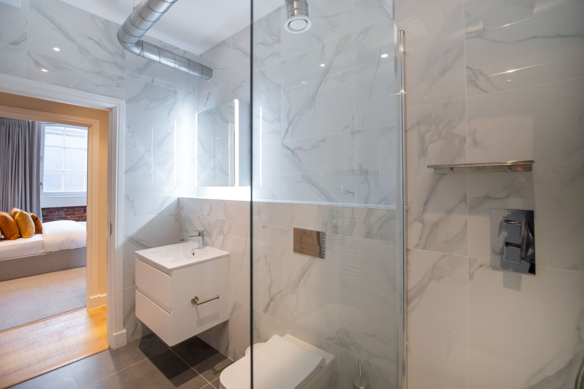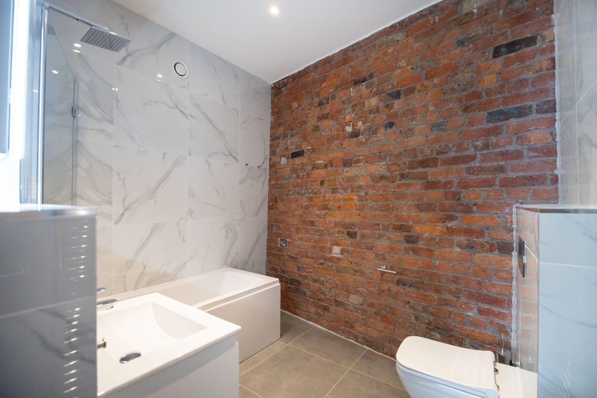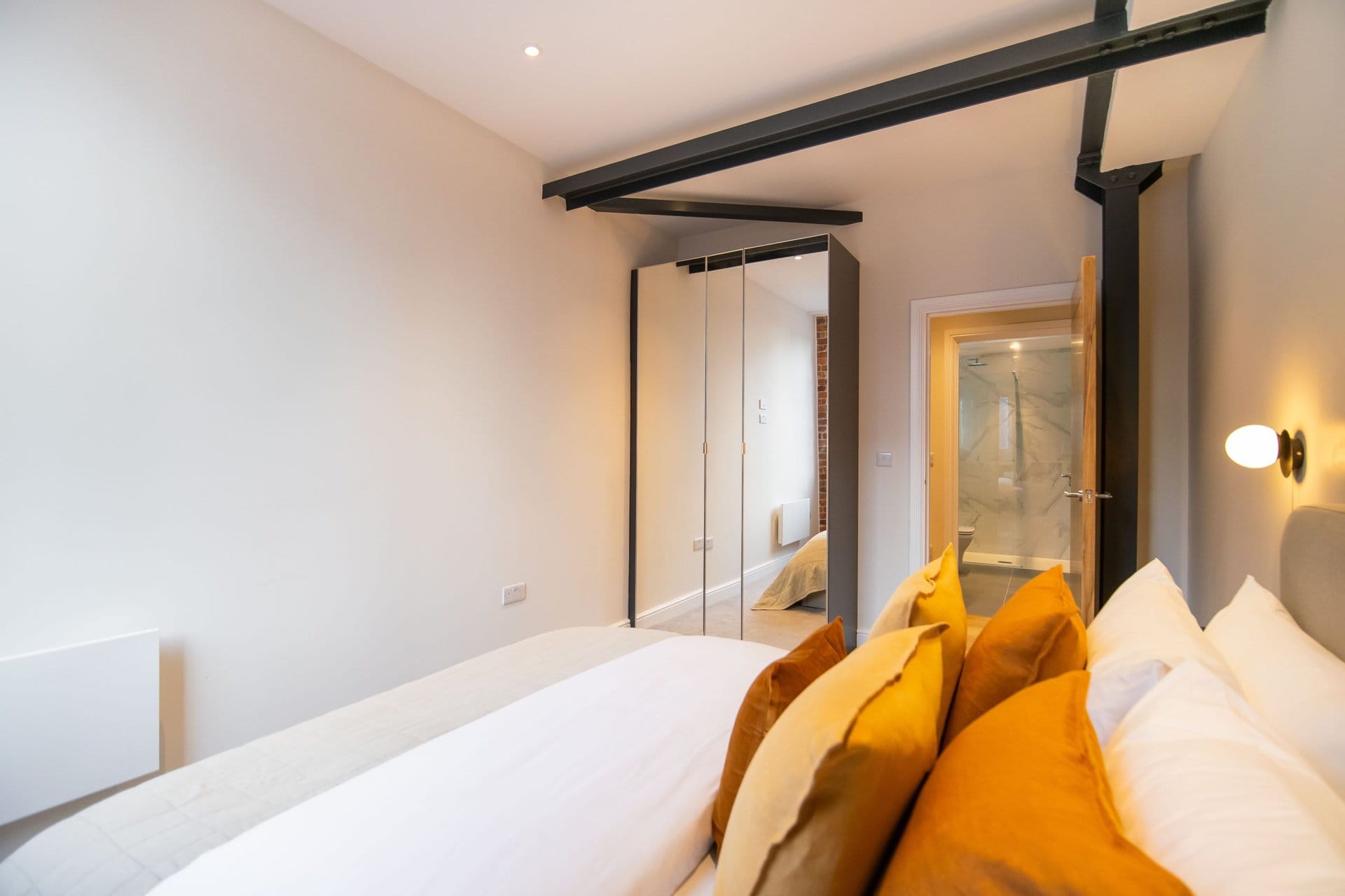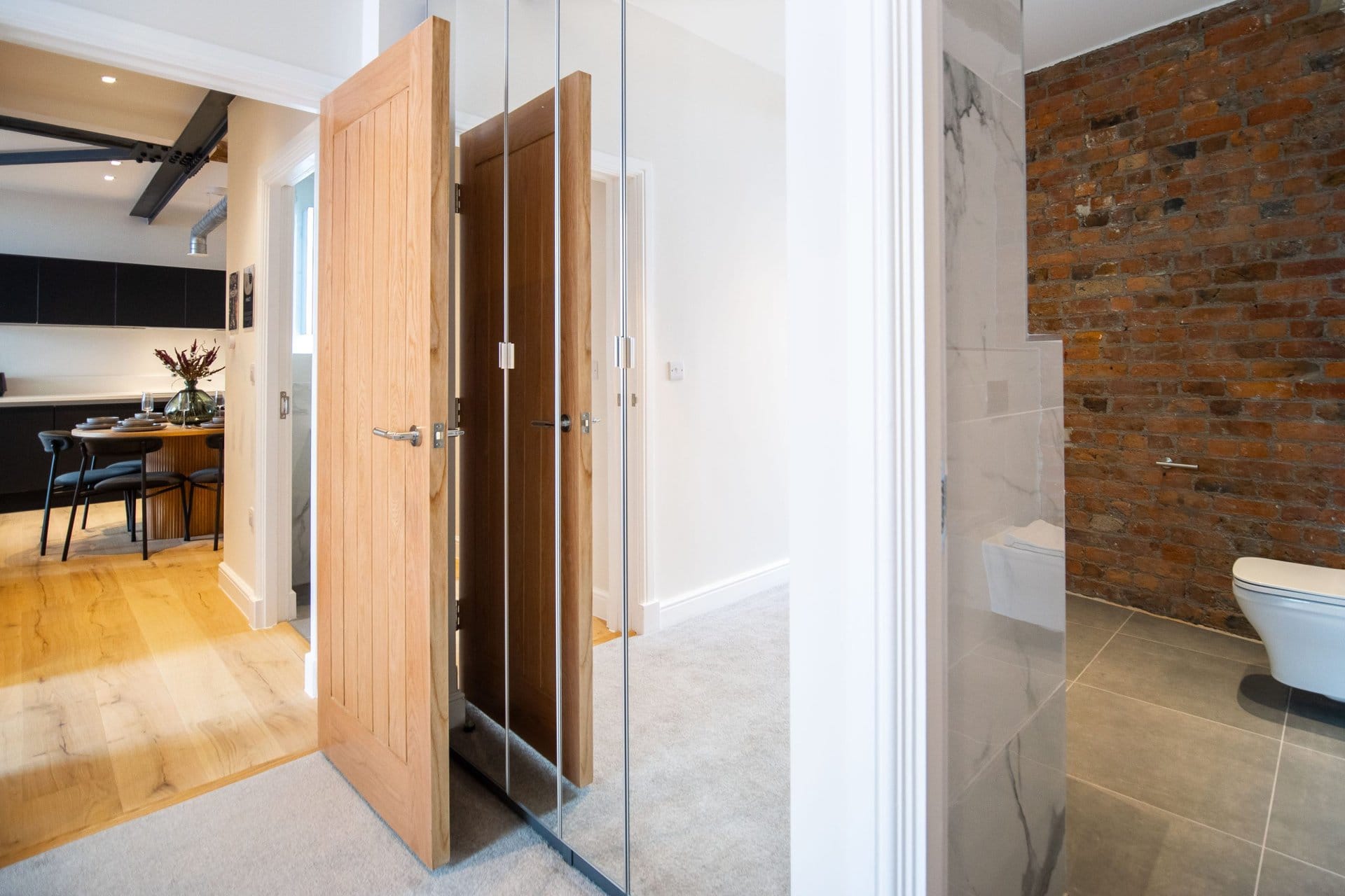 The bathrooms balance simplicity with luxury.Boasting a large walk in shower  in the upstairs en suite and a spacious tub in the downstairs both bathrooms have mirrored cabinets that help bounce light around the rooms.Â