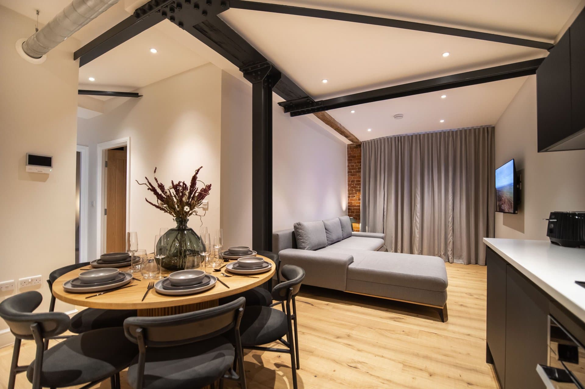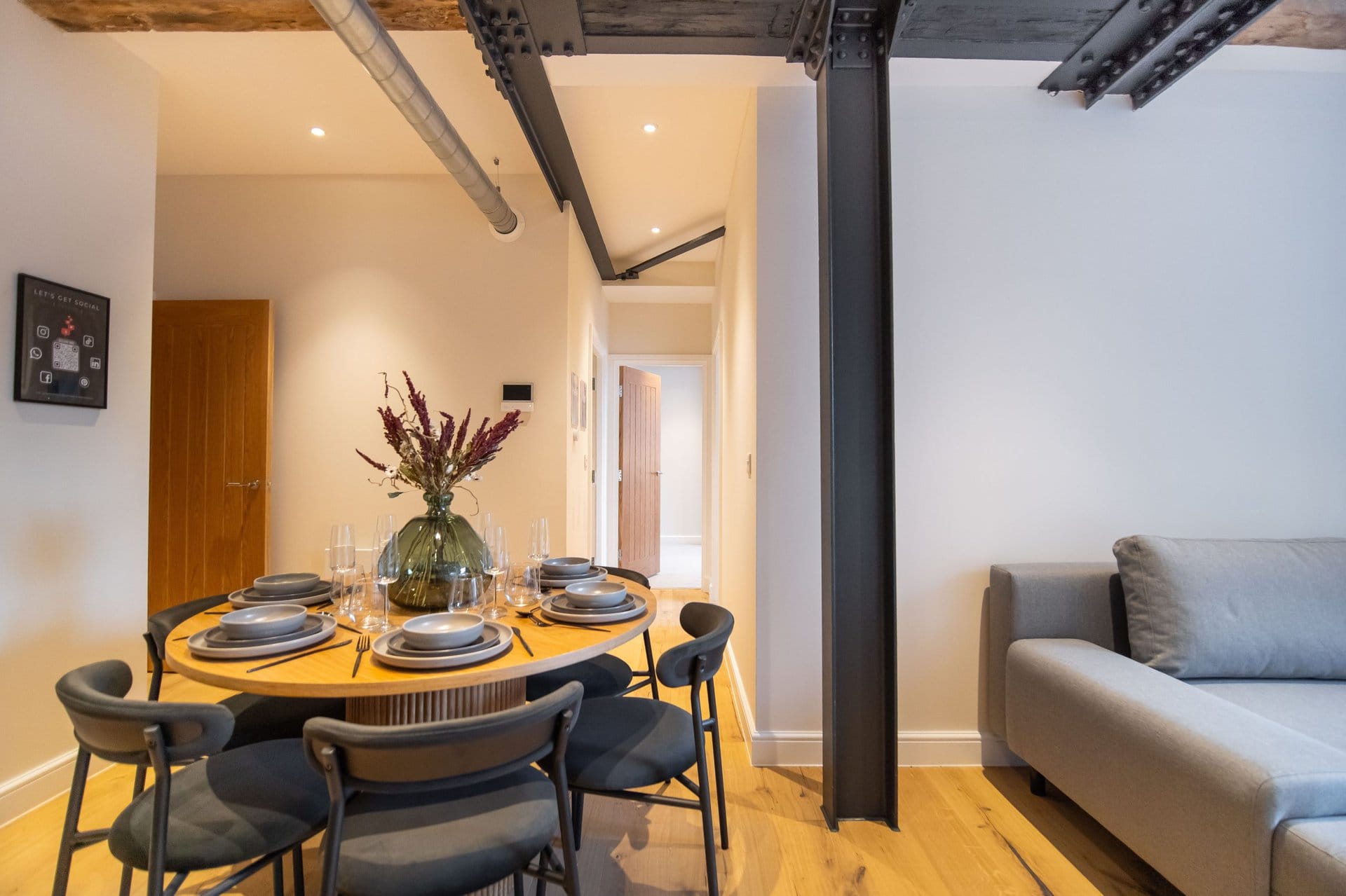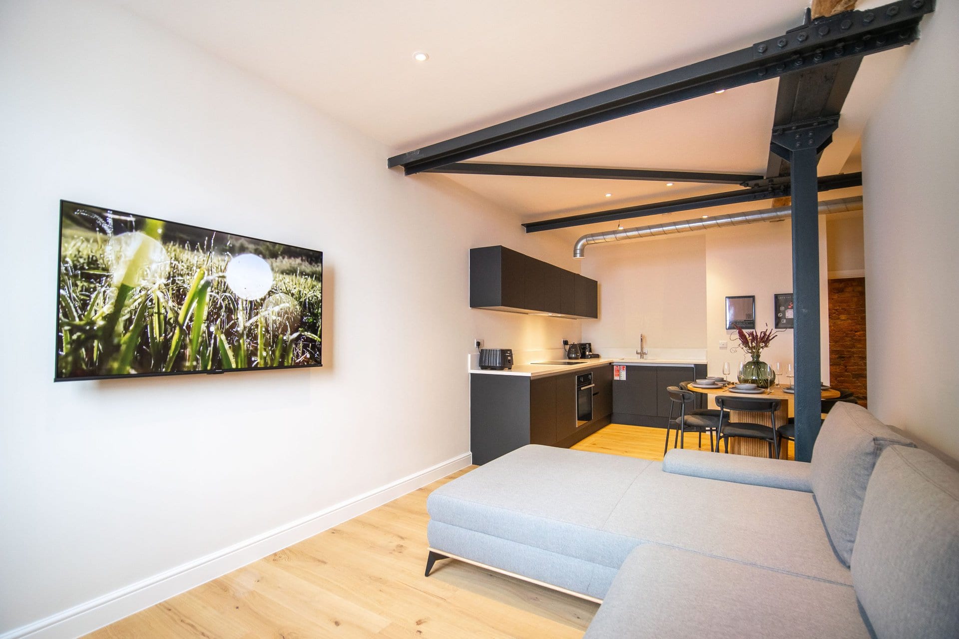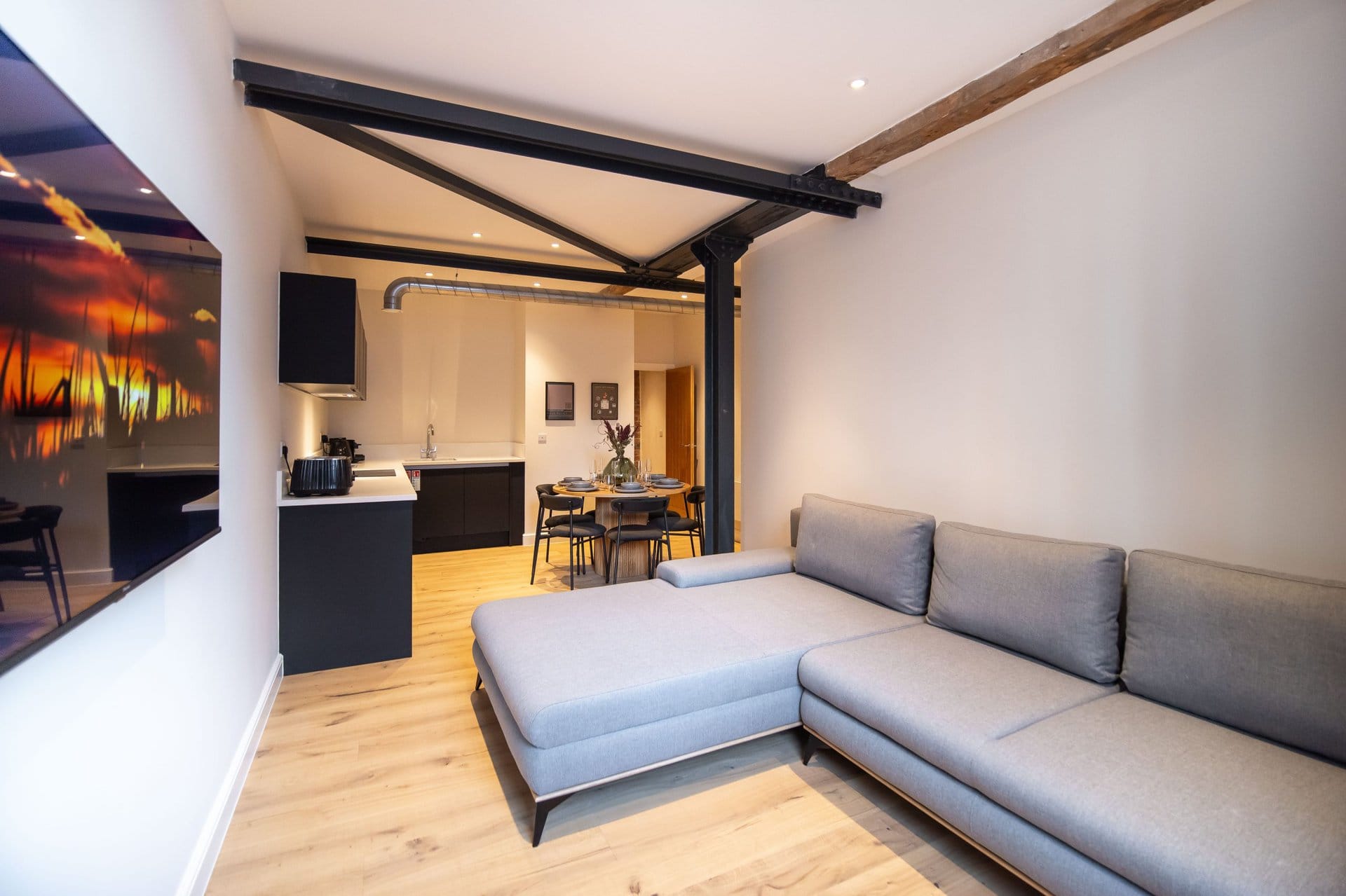 The living space boasts impressively high ceilings, an extremely comfortable sofa and a 50 inch Sky Glass TV with all streaming platforms. This is the ideal space to relax and wind down.Â