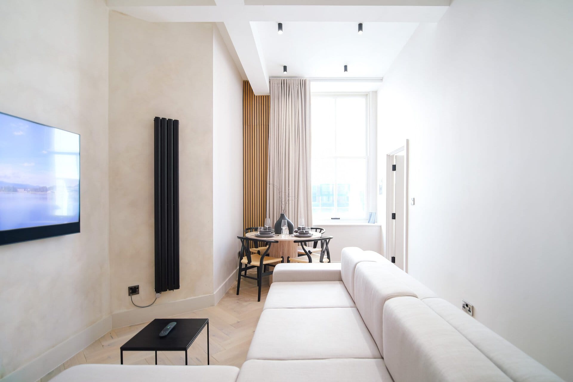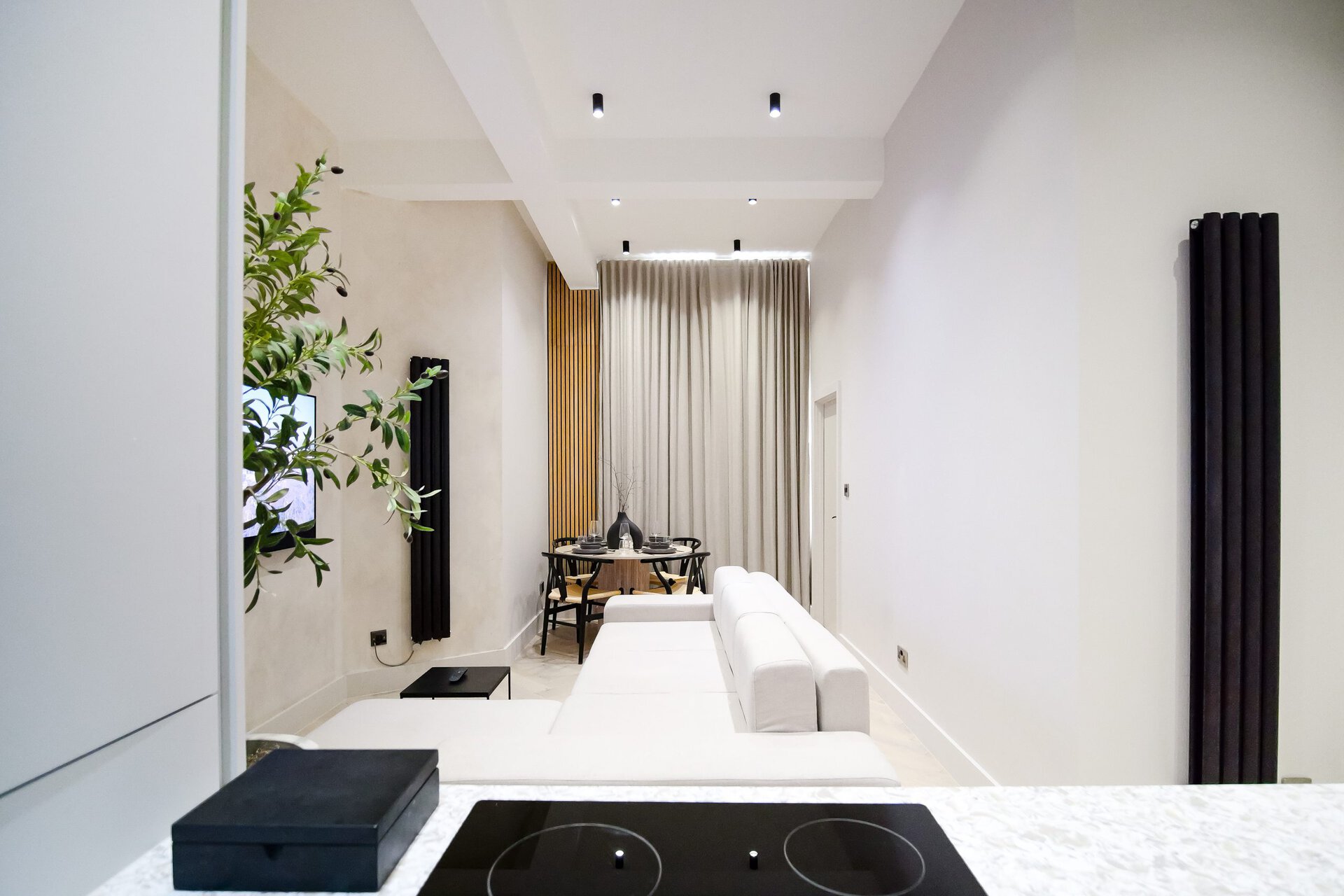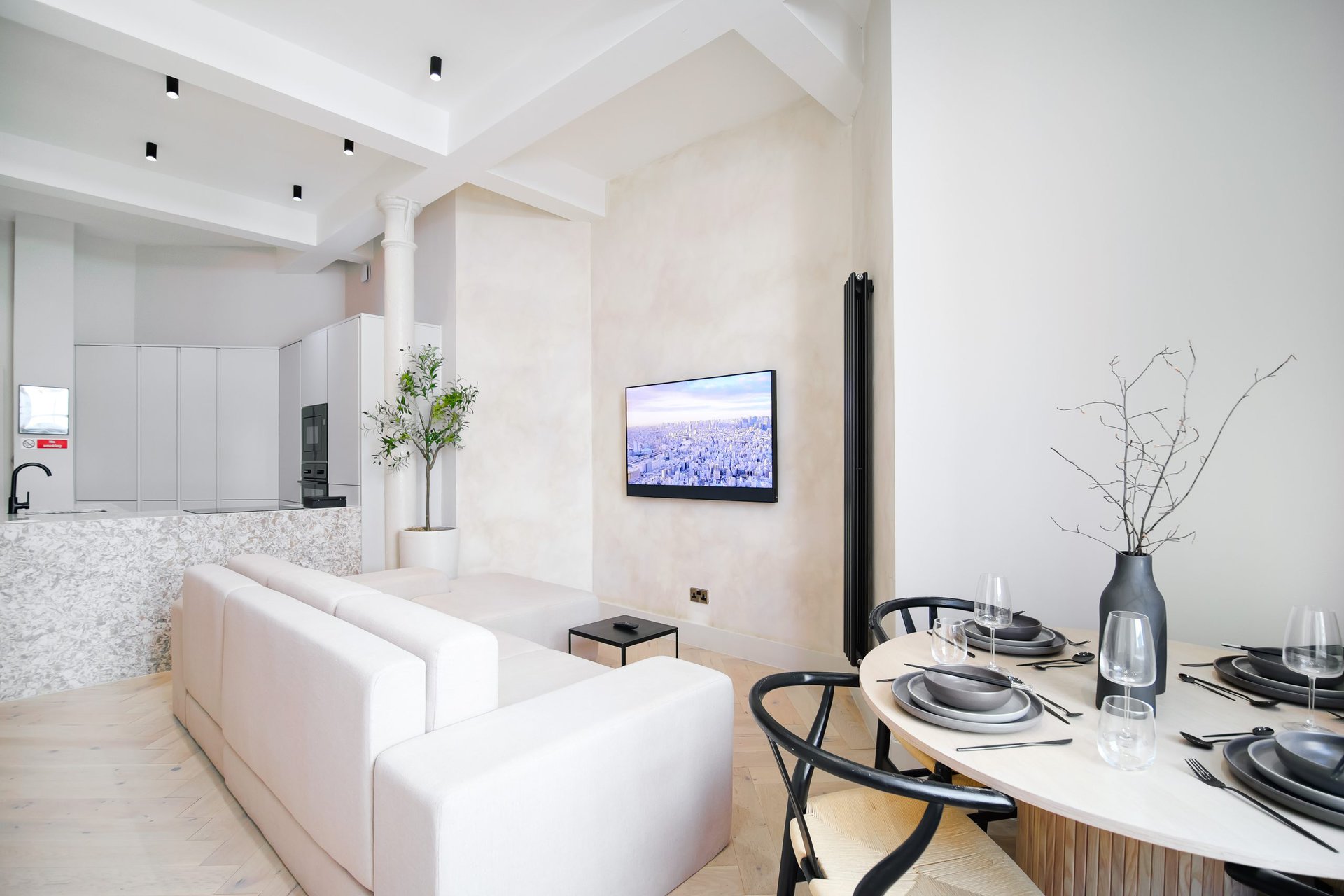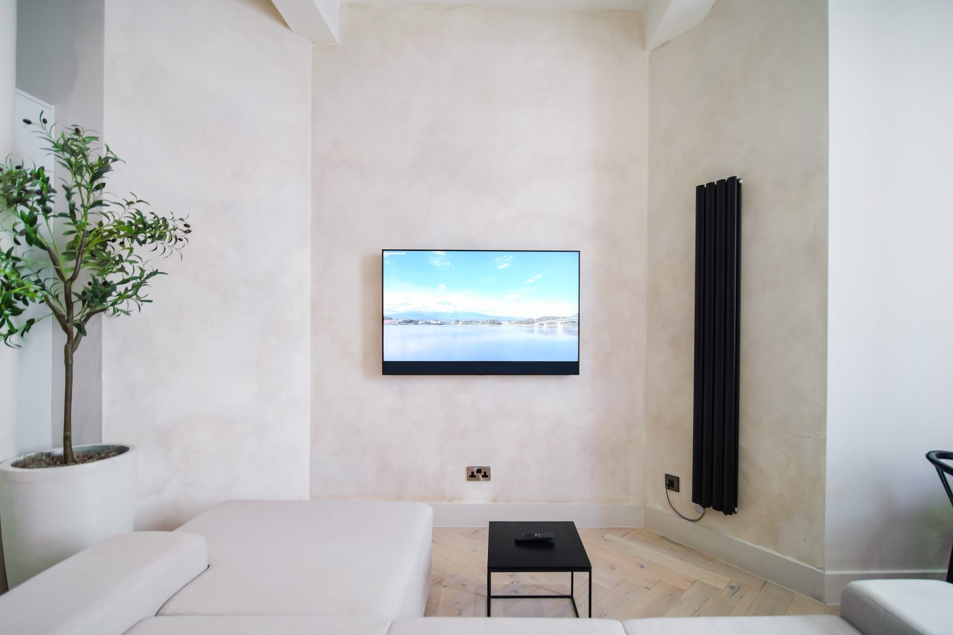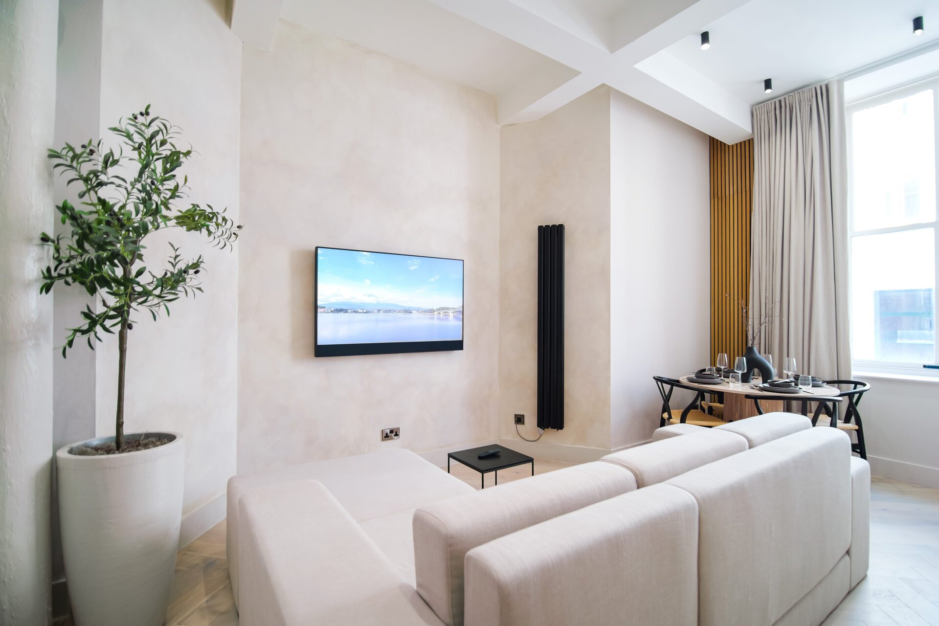 The living space boasts impressively high ceilings, an extremely comfortable sofa and a 50 inch Sky Glass TV with all streaming platforms. This is the ideal space to relax and wind down.Â