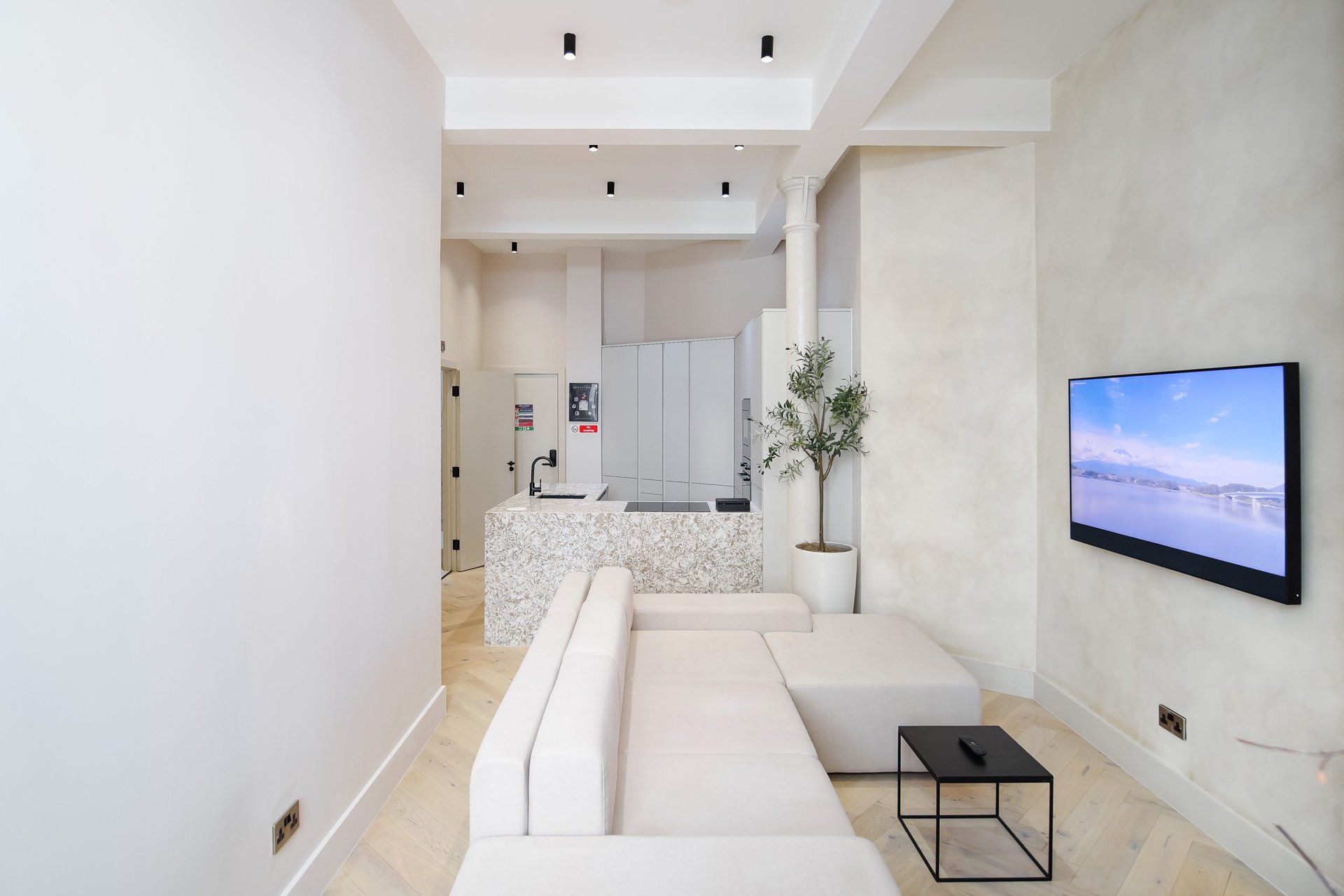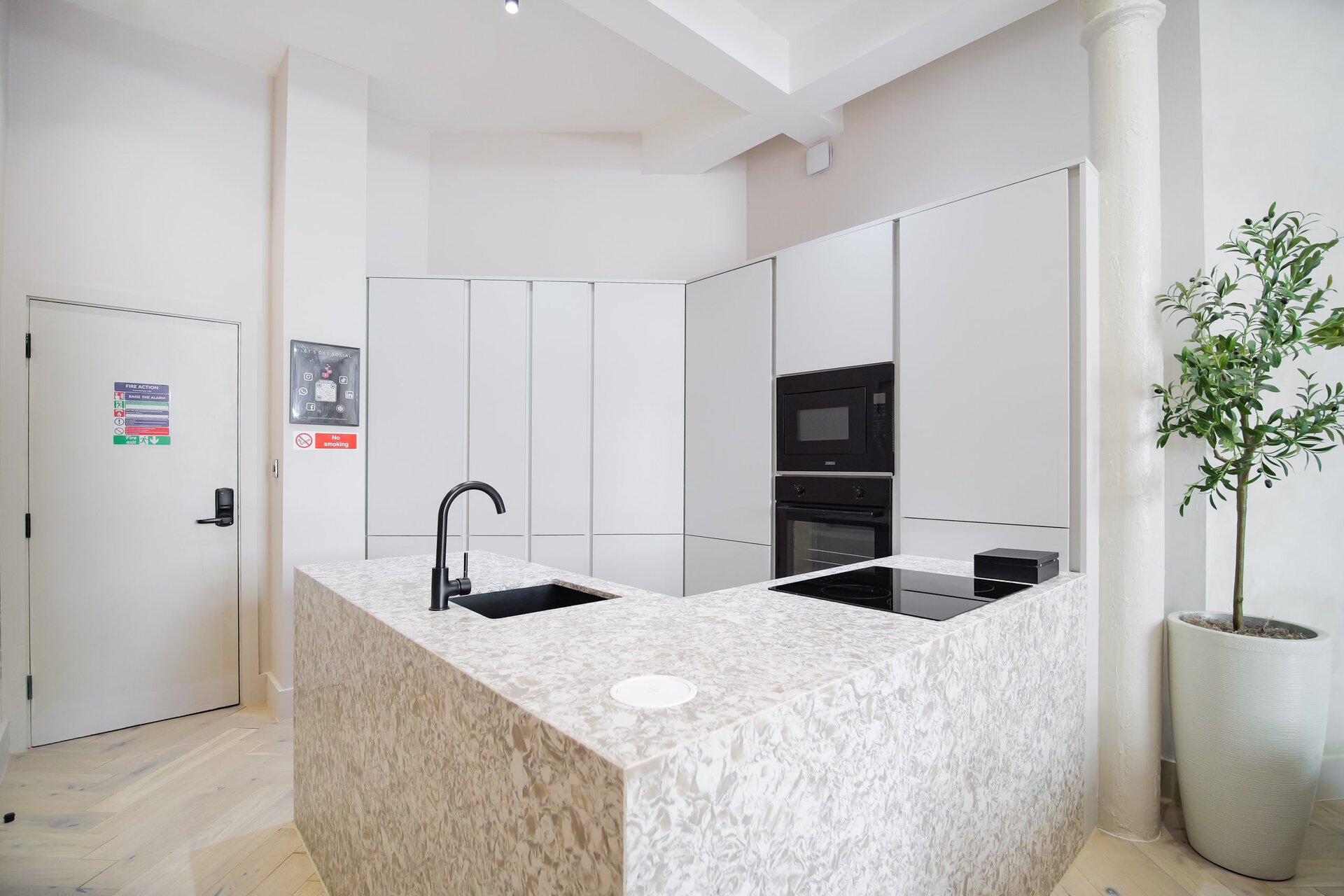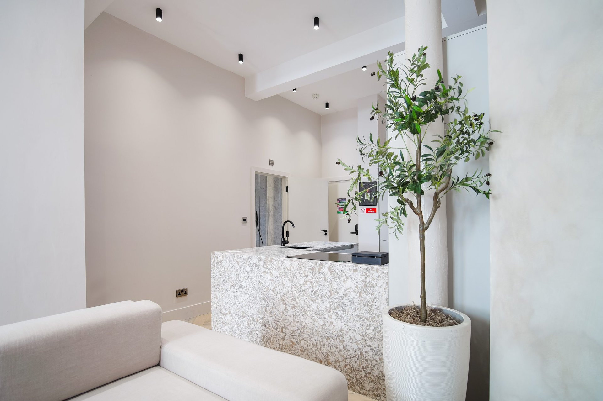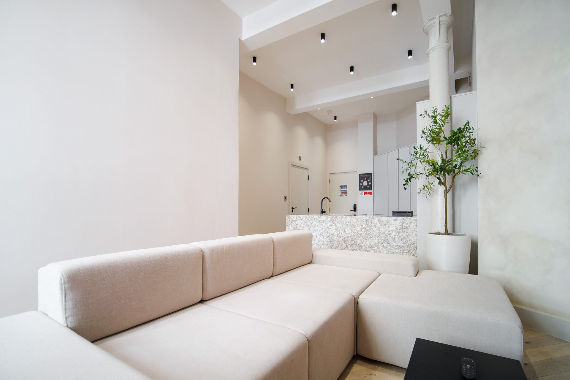 The living space boasts impressively high ceilings, an extremely comfortable sofa and a 50 inch Sky Glass TV with all streaming platforms. This is the ideal space to relax and wind down.Â