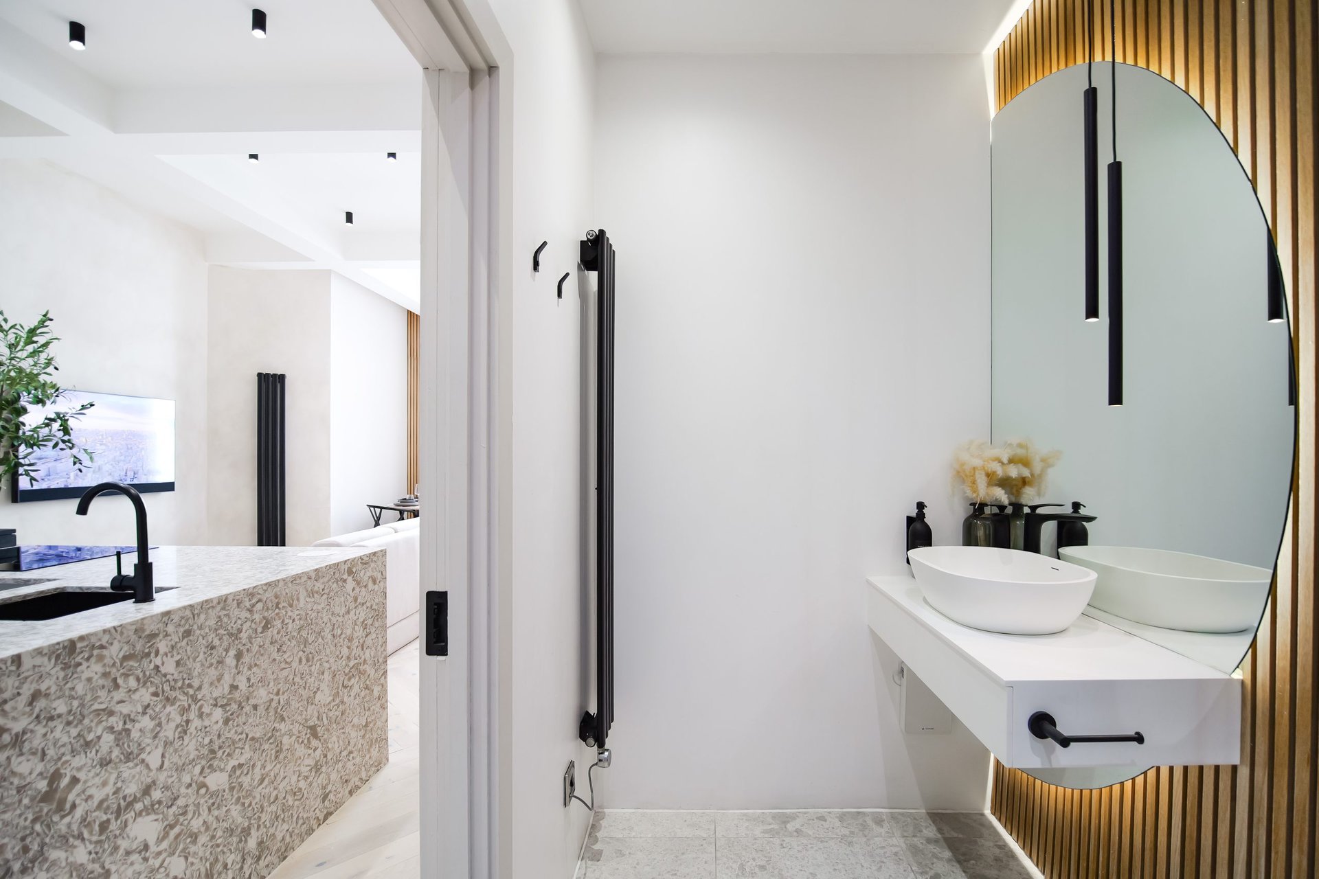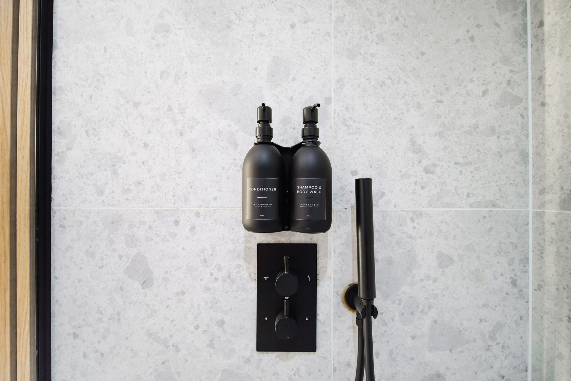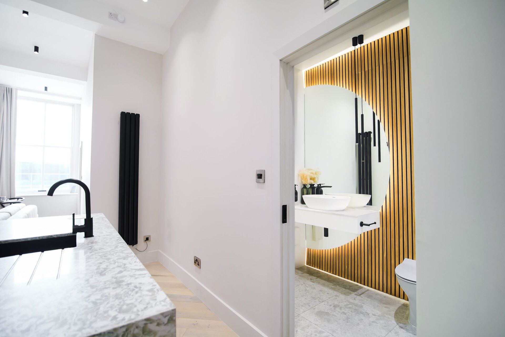 The bathrooms balance simplicity with luxury.Boasting a large walk in shower  in the upstairs en suite and a spacious tub in the downstairs both bathrooms have mirrored cabinets that help bounce light around the rooms.Â