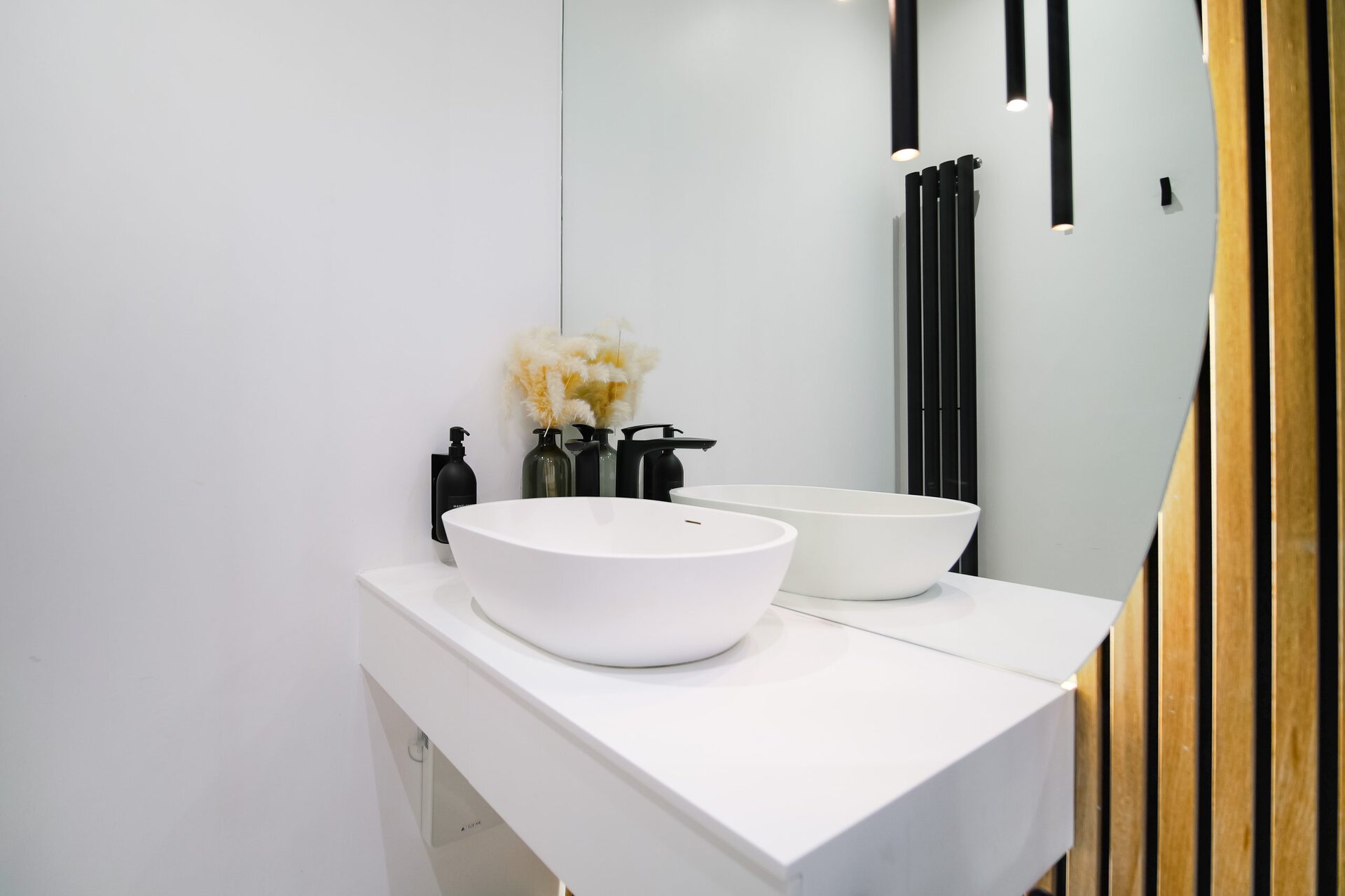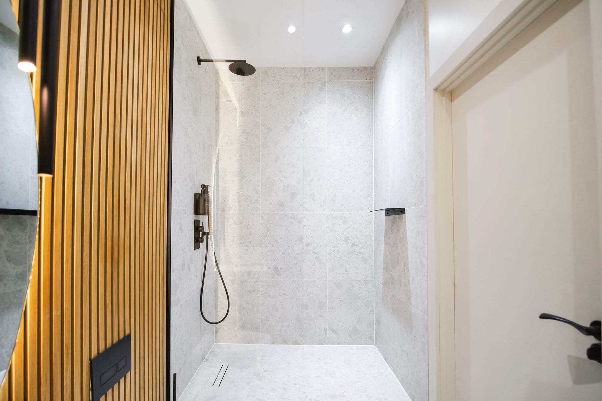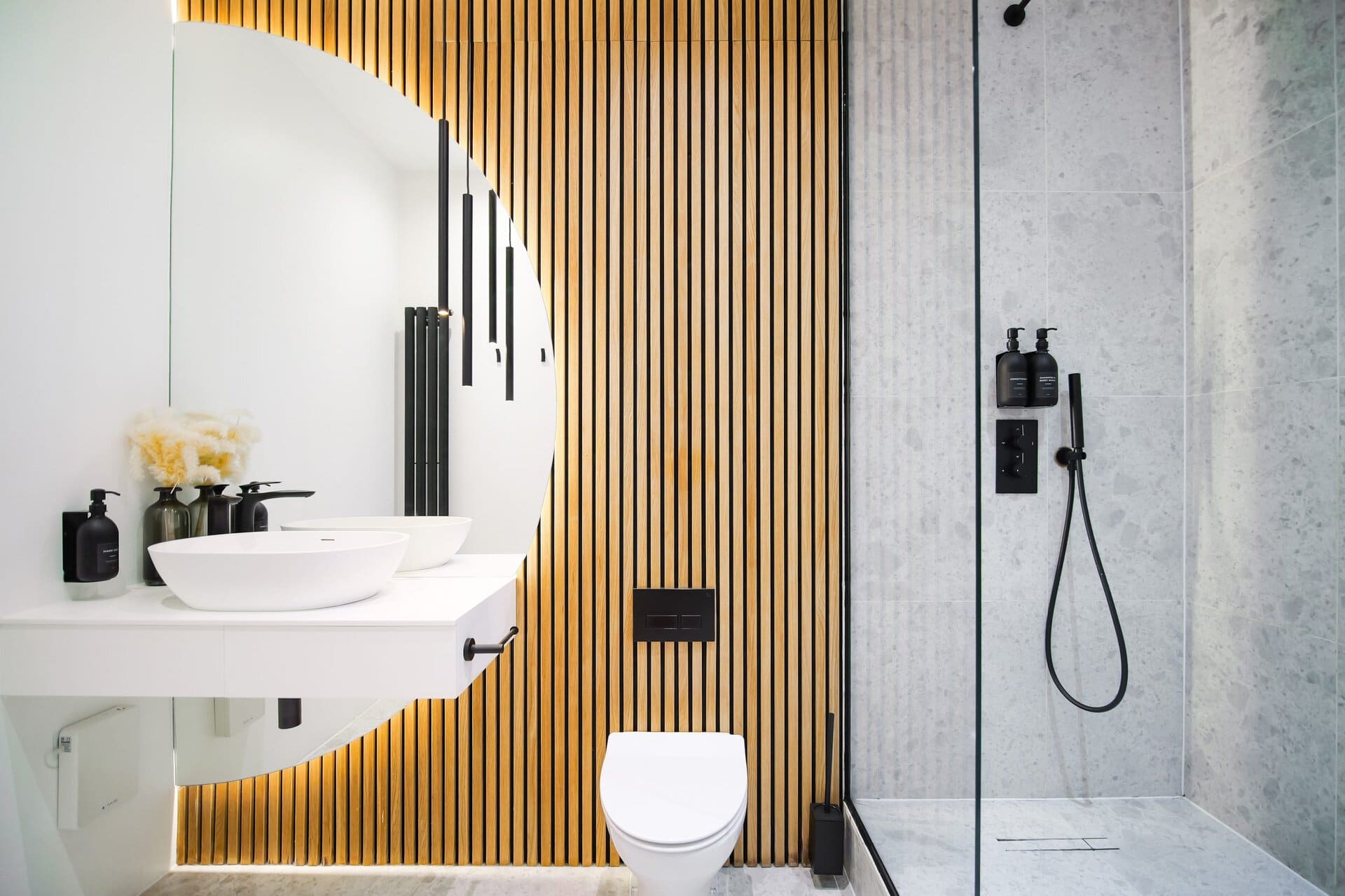 The bathrooms balance simplicity with luxury.Boasting a large walk in shower  in the upstairs en suite and a spacious tub in the downstairs both bathrooms have mirrored cabinets that help bounce light around the rooms.Â
