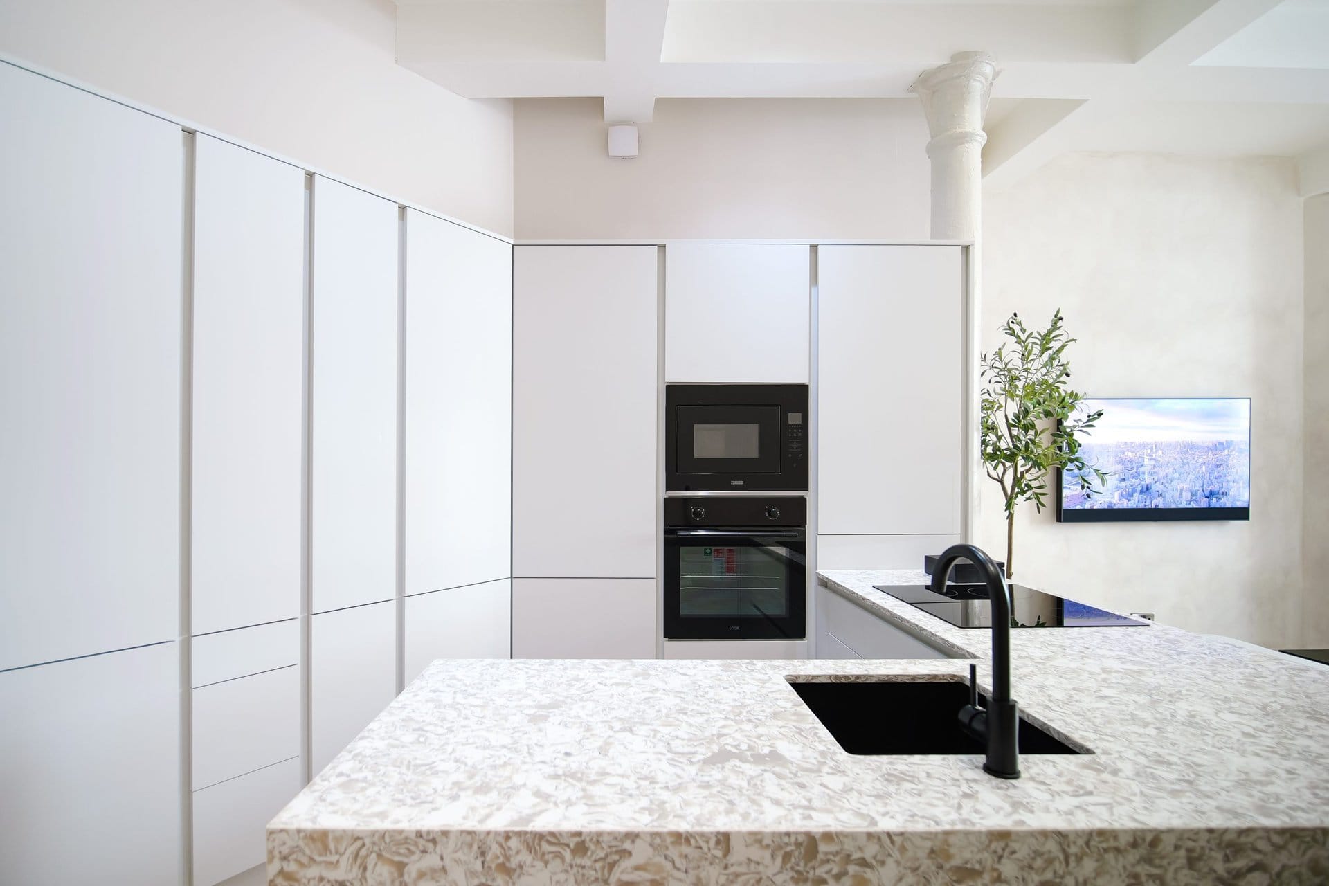 The kitchen features sleek beige cabinetry and wrap around stone countertops providing a perfect backdrop for culinary creativity. The multifunctional kitchen island is the heart of this apartment, boasting ample cooking space and doubling as a dining area.