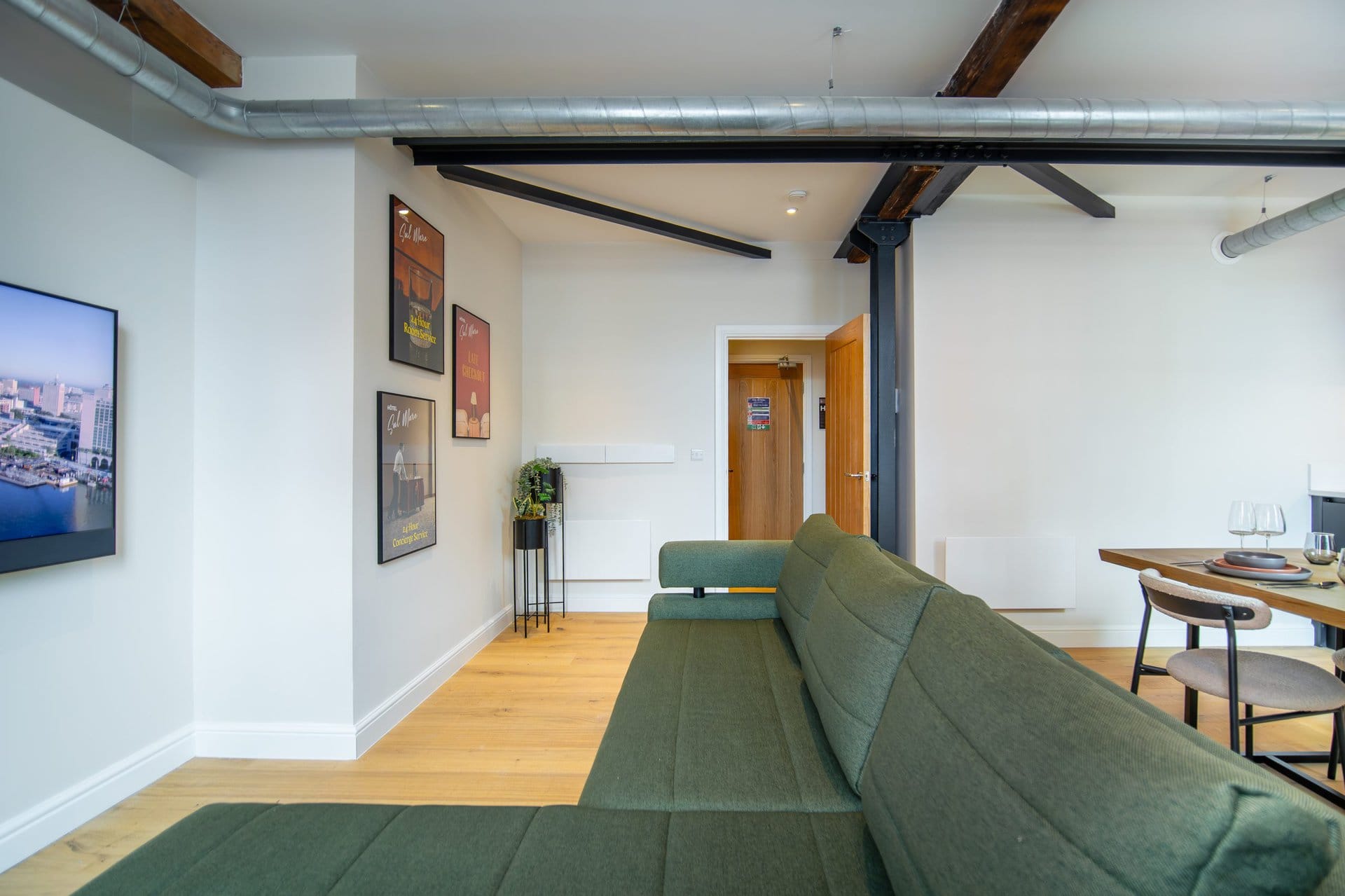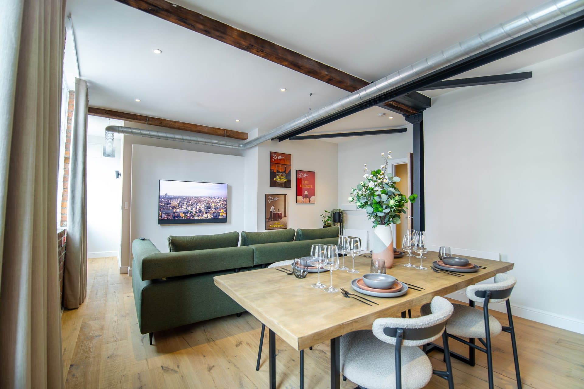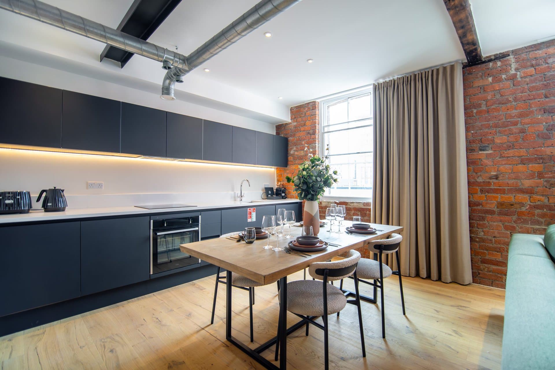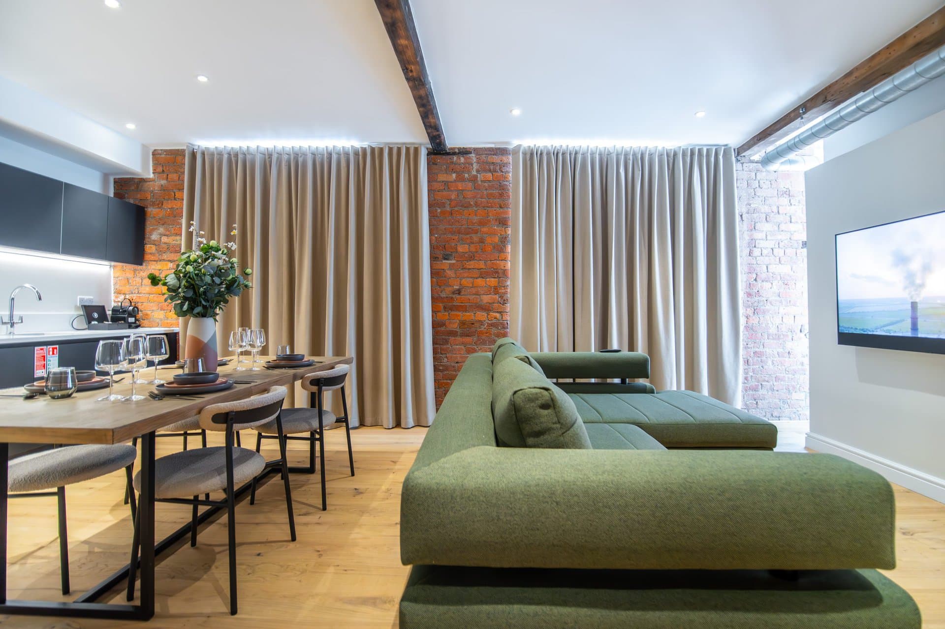 The living space boasts impressively high ceilings, an extremely comfortable sofa and a 50 inch Sky Glass TV with all streaming platforms. This is the ideal space to relax and wind down.Â