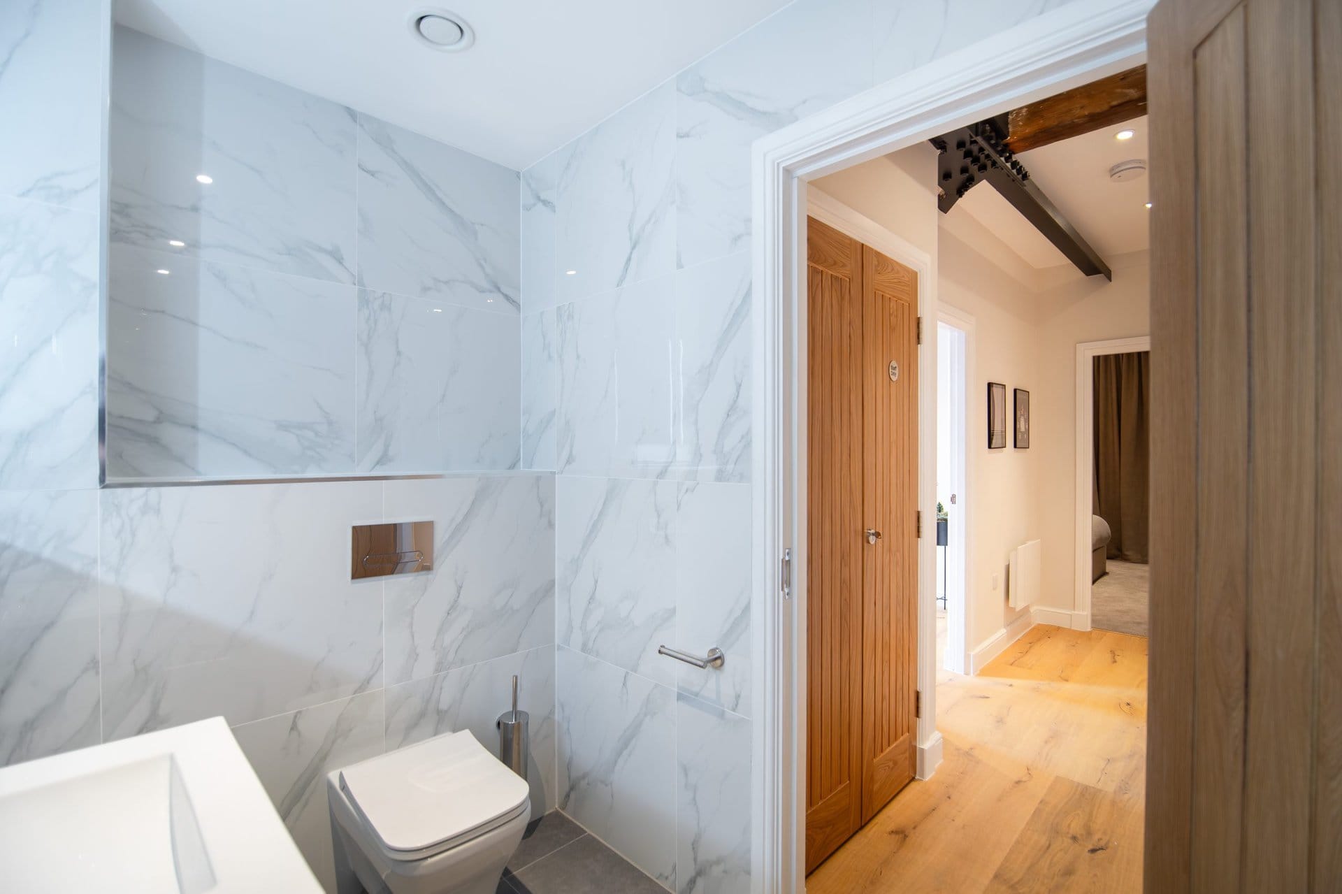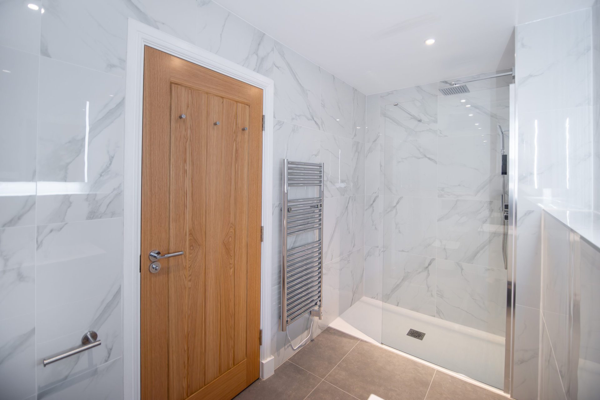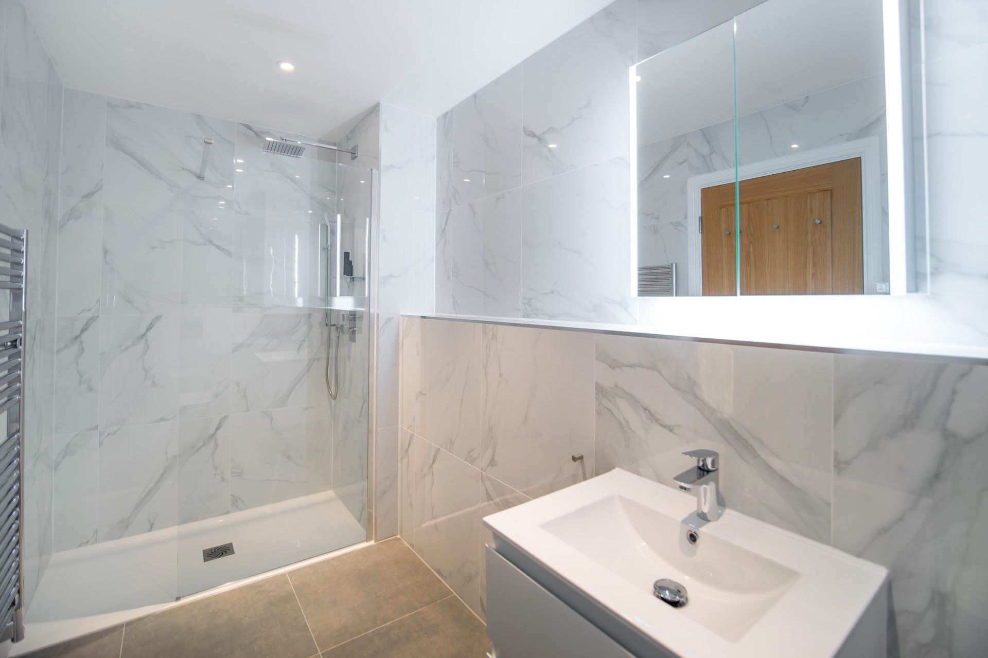 The bathrooms balance simplicity with luxury.Boasting a large walk in shower  in the upstairs en suite and a spacious tub in the downstairs both bathrooms have mirrored cabinets that help bounce light around the rooms.Â