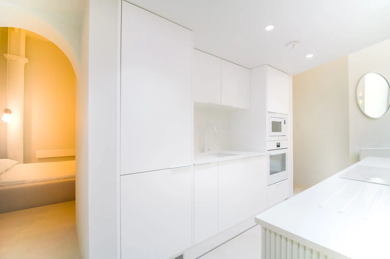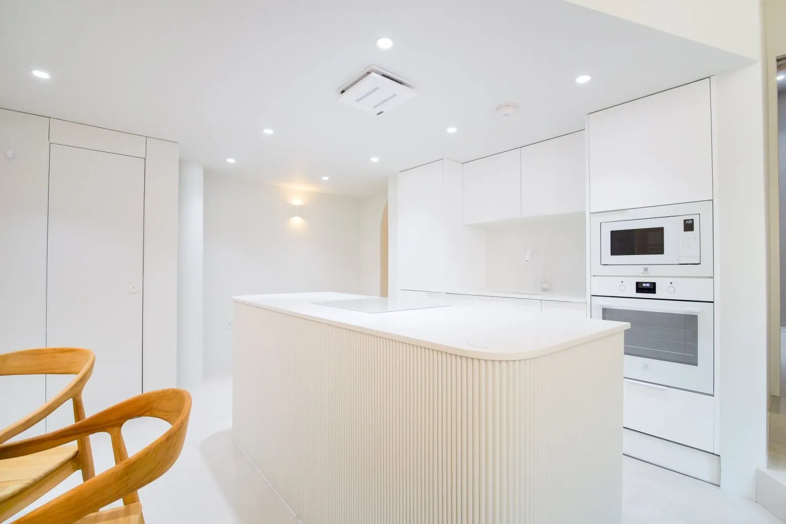 The kitchen features sleek beige cabinetry and wrap around stone countertops providing a perfect backdrop for culinary creativity. The multifunctional kitchen island is the heart of this apartment, boasting ample cooking space and doubling as a dining area.
