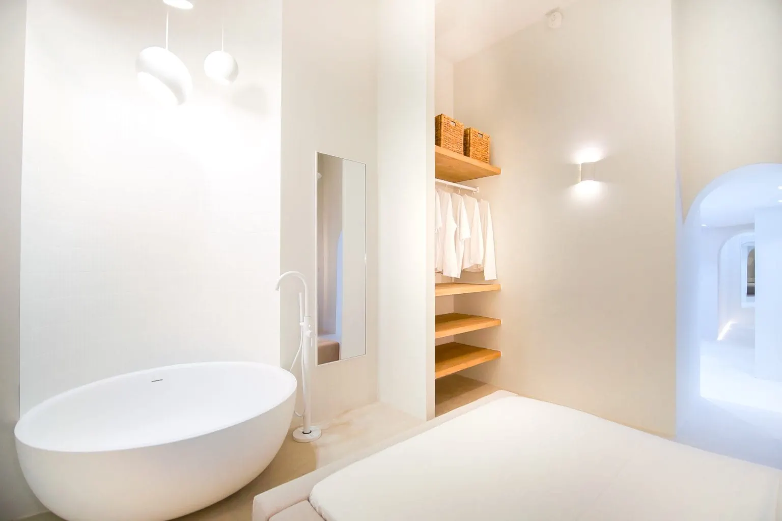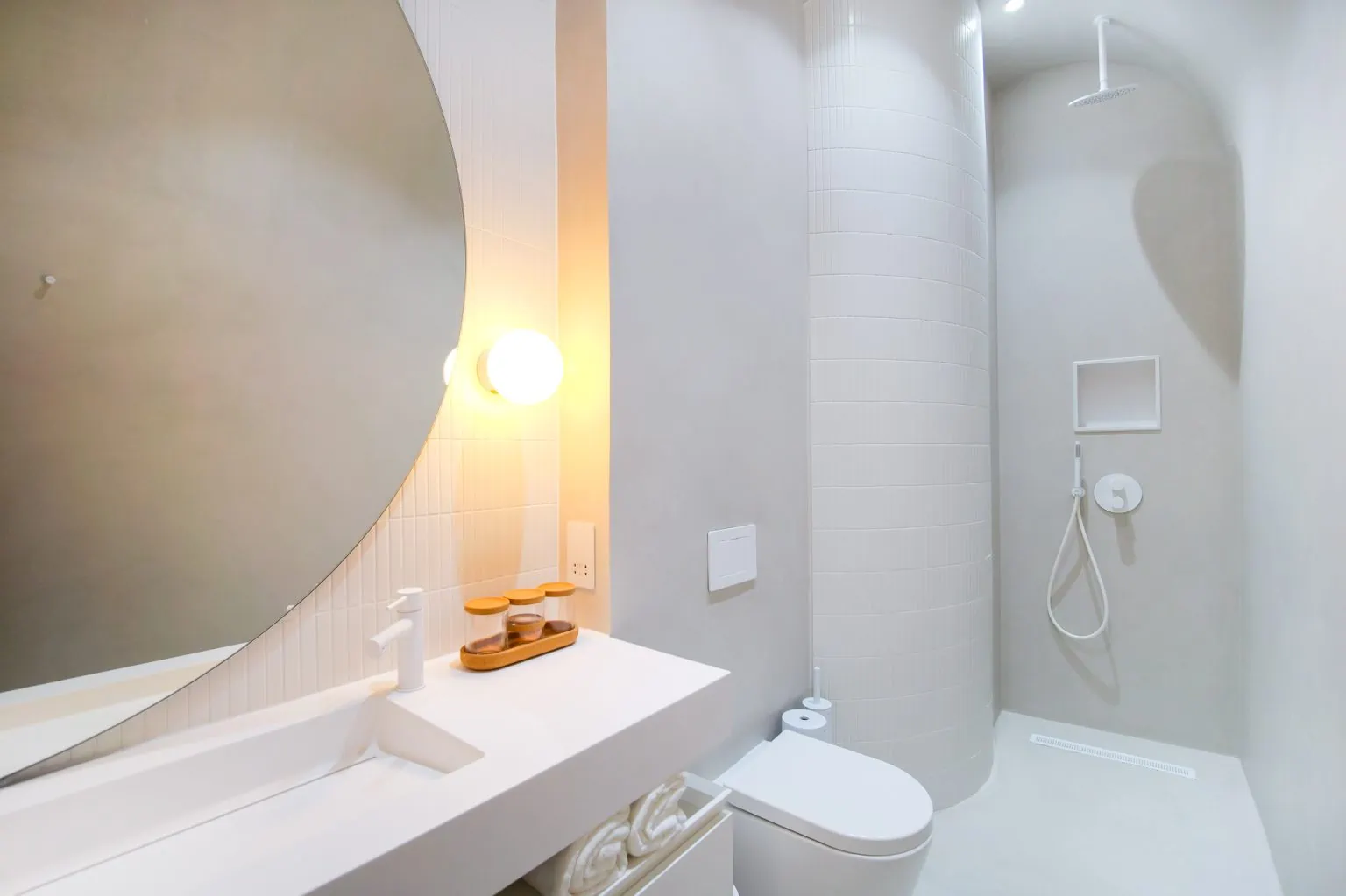 The bathrooms balance simplicity with luxury.Boasting a large walk in shower  in the upstairs en suite and a spacious tub in the downstairs both bathrooms have mirrored cabinets that help bounce light around the rooms.Â