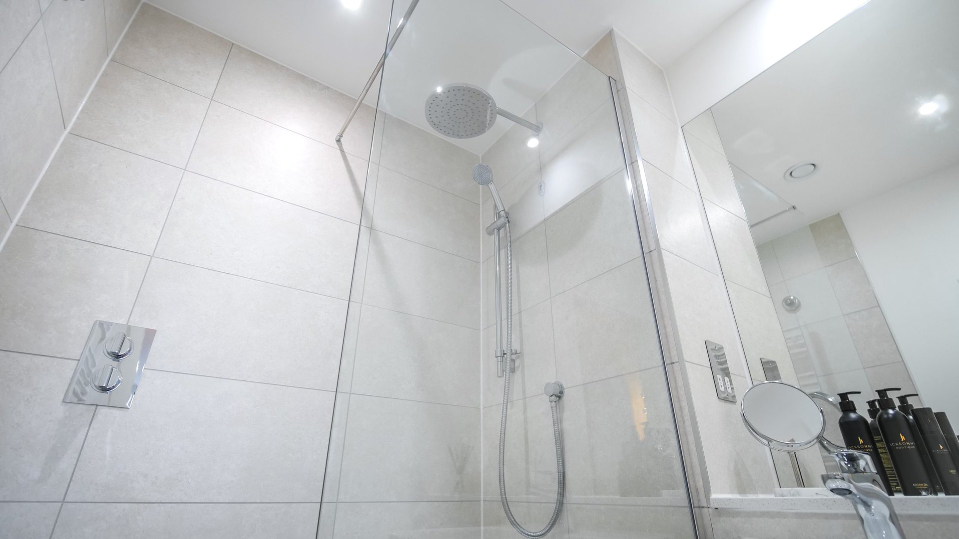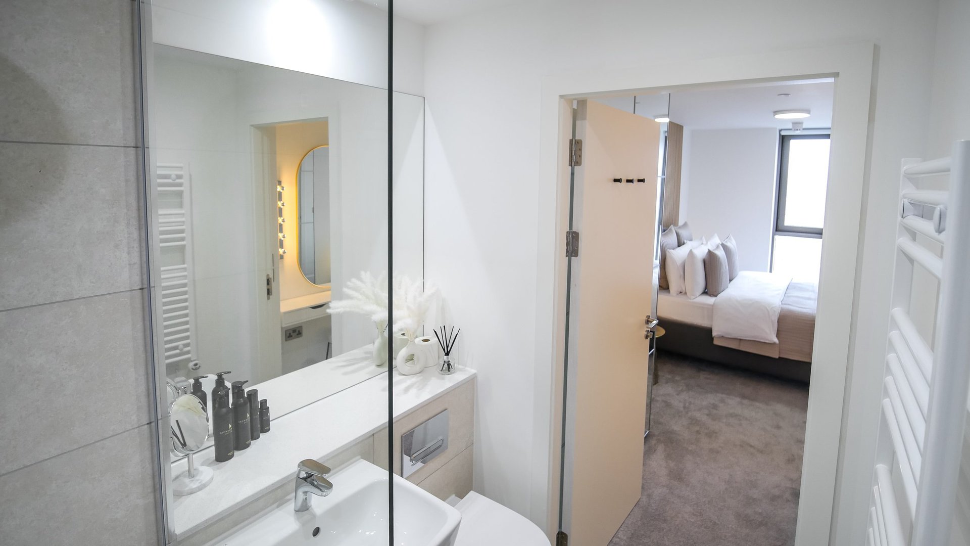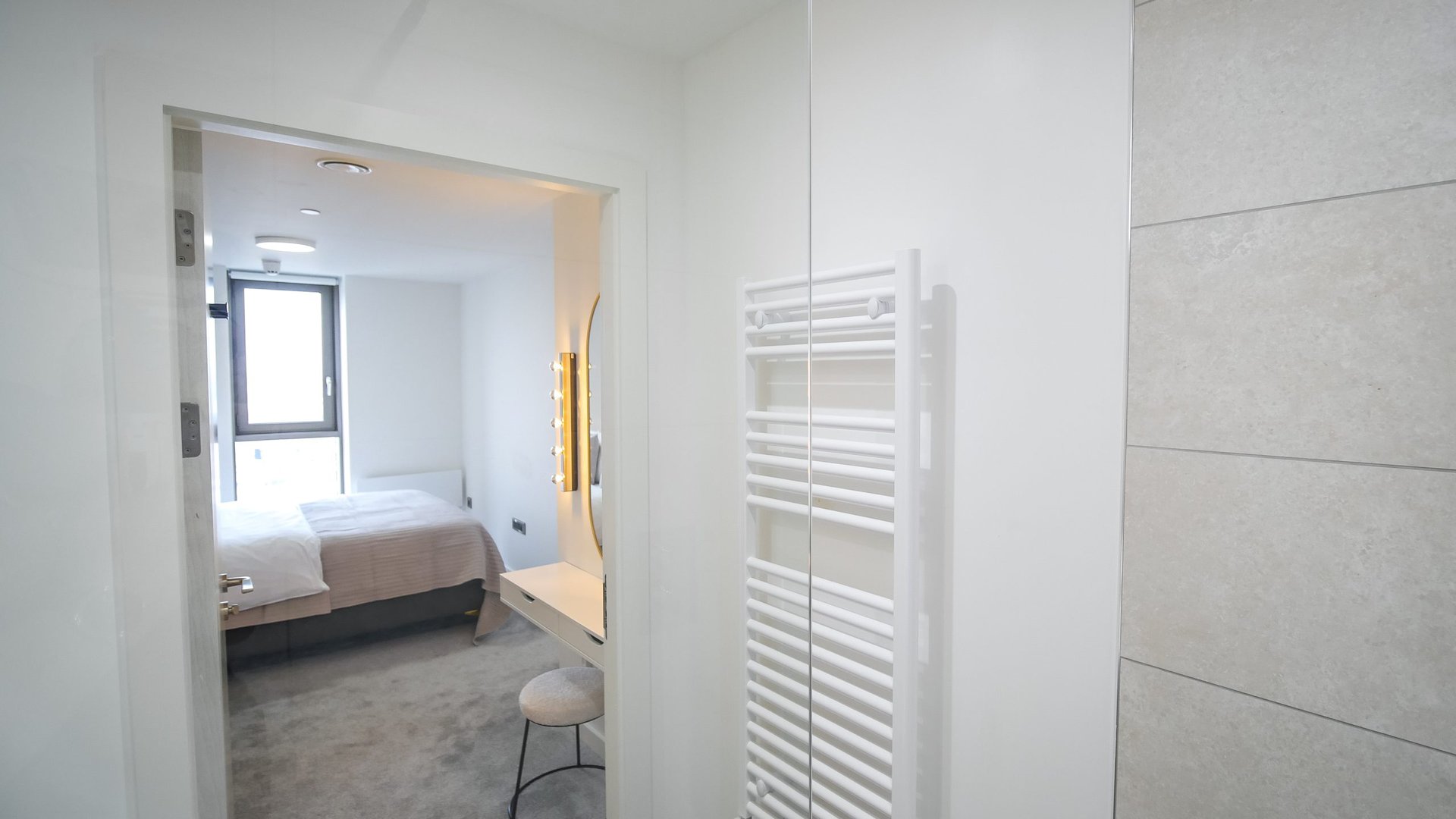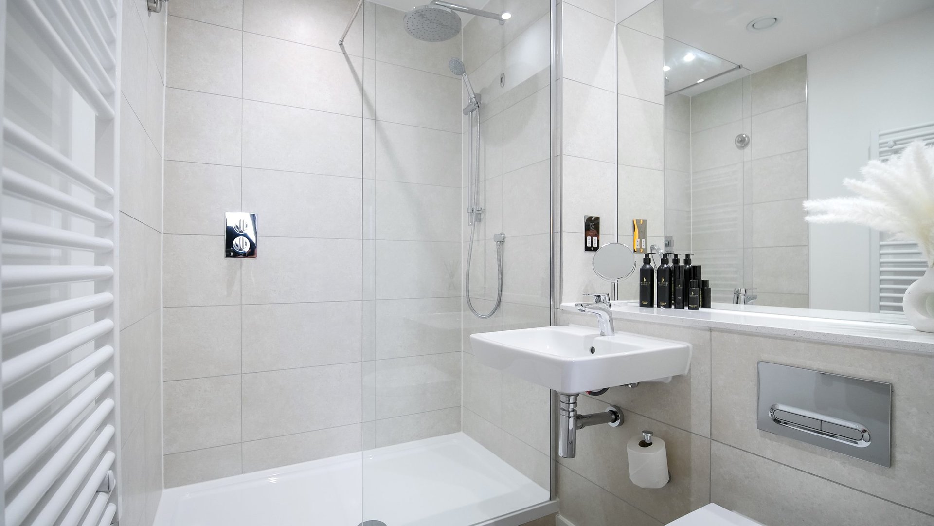 The bathrooms balance simplicity with luxury.Boasting a large walk in shower  in the upstairs en suite and a spacious tub in the downstairs both bathrooms have mirrored cabinets that help bounce light around the rooms.Â