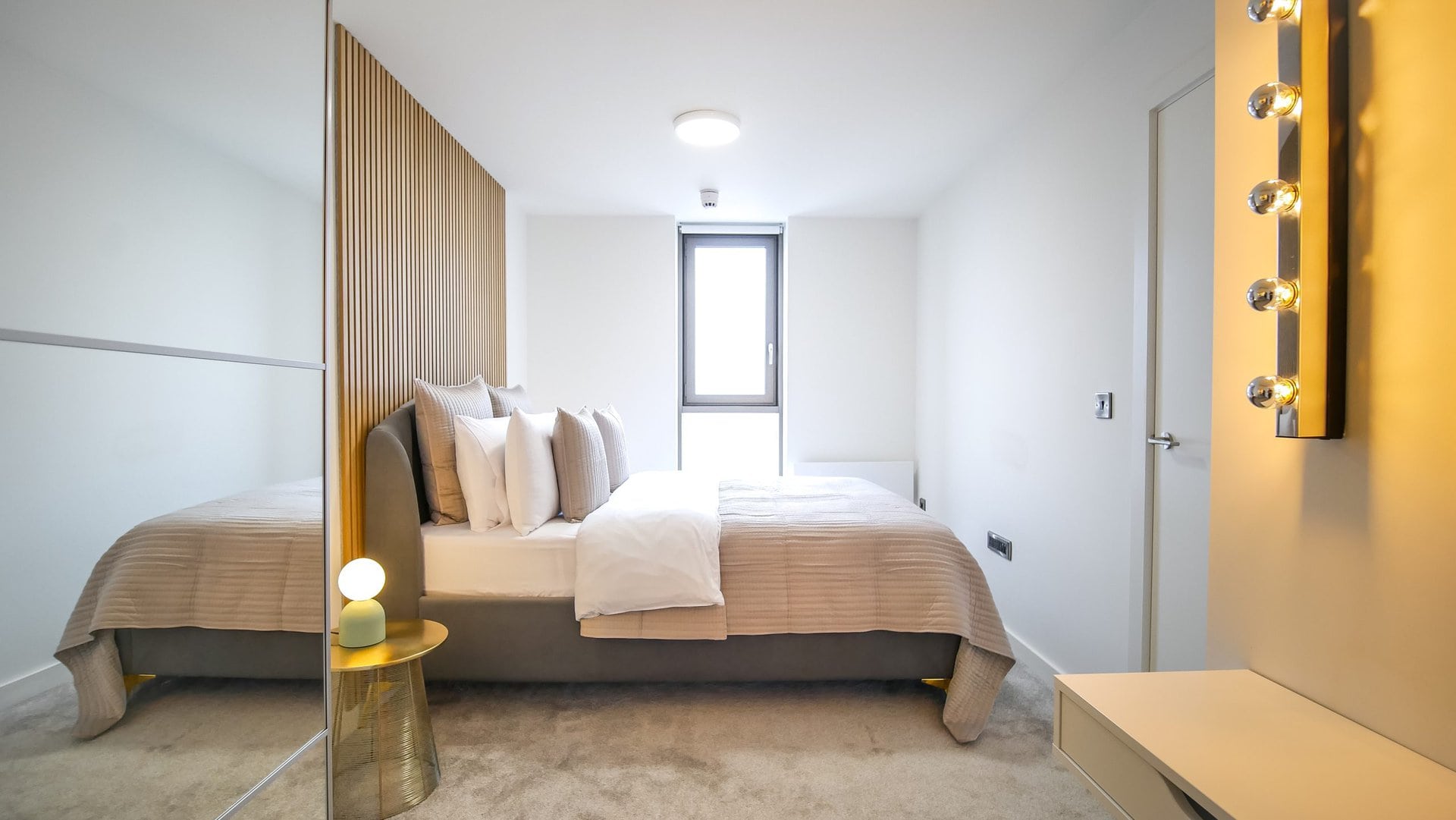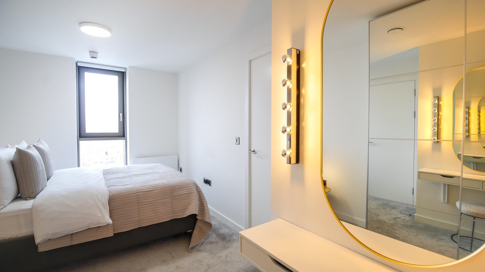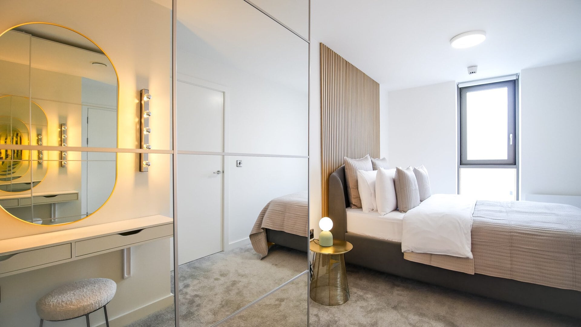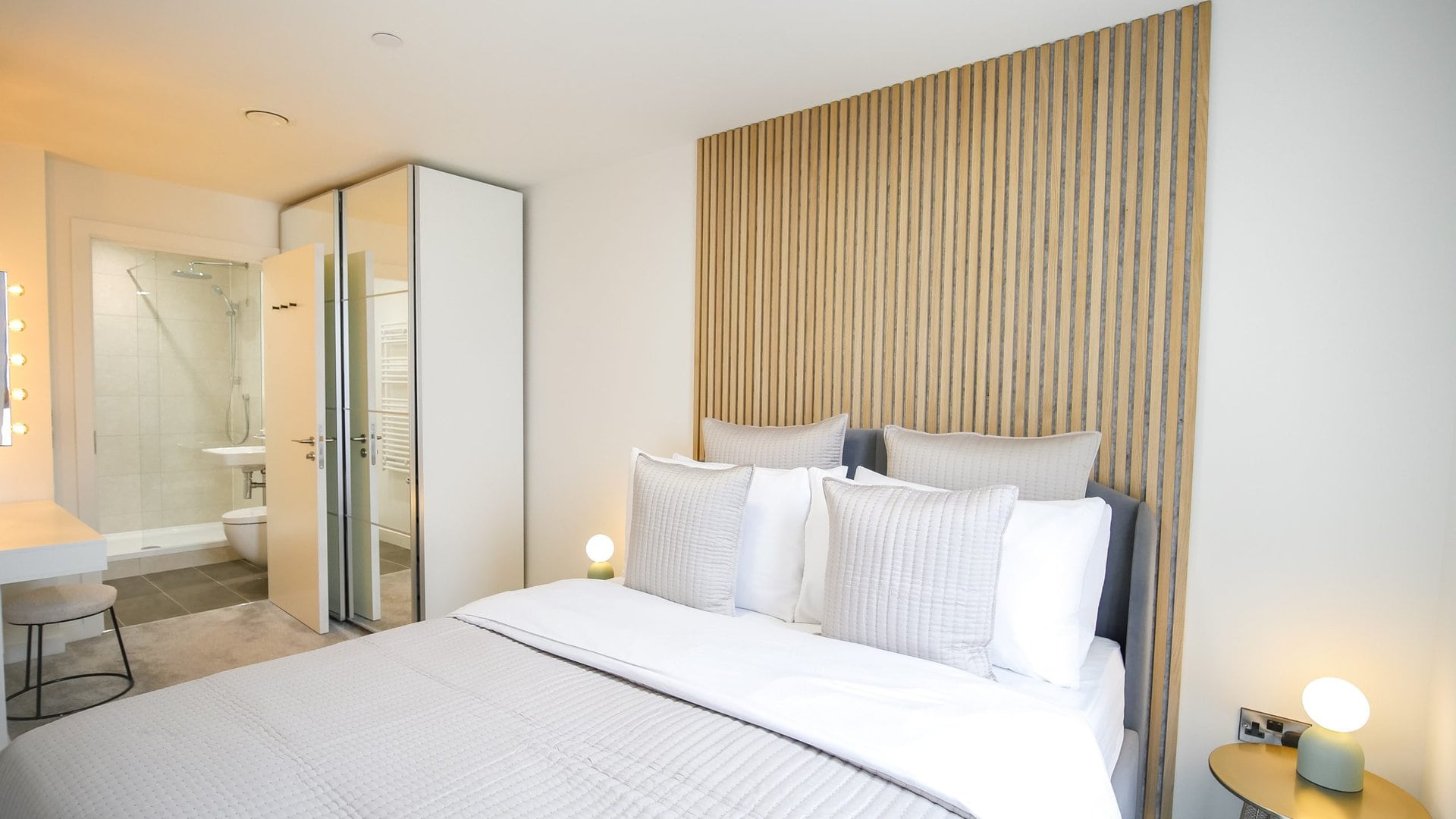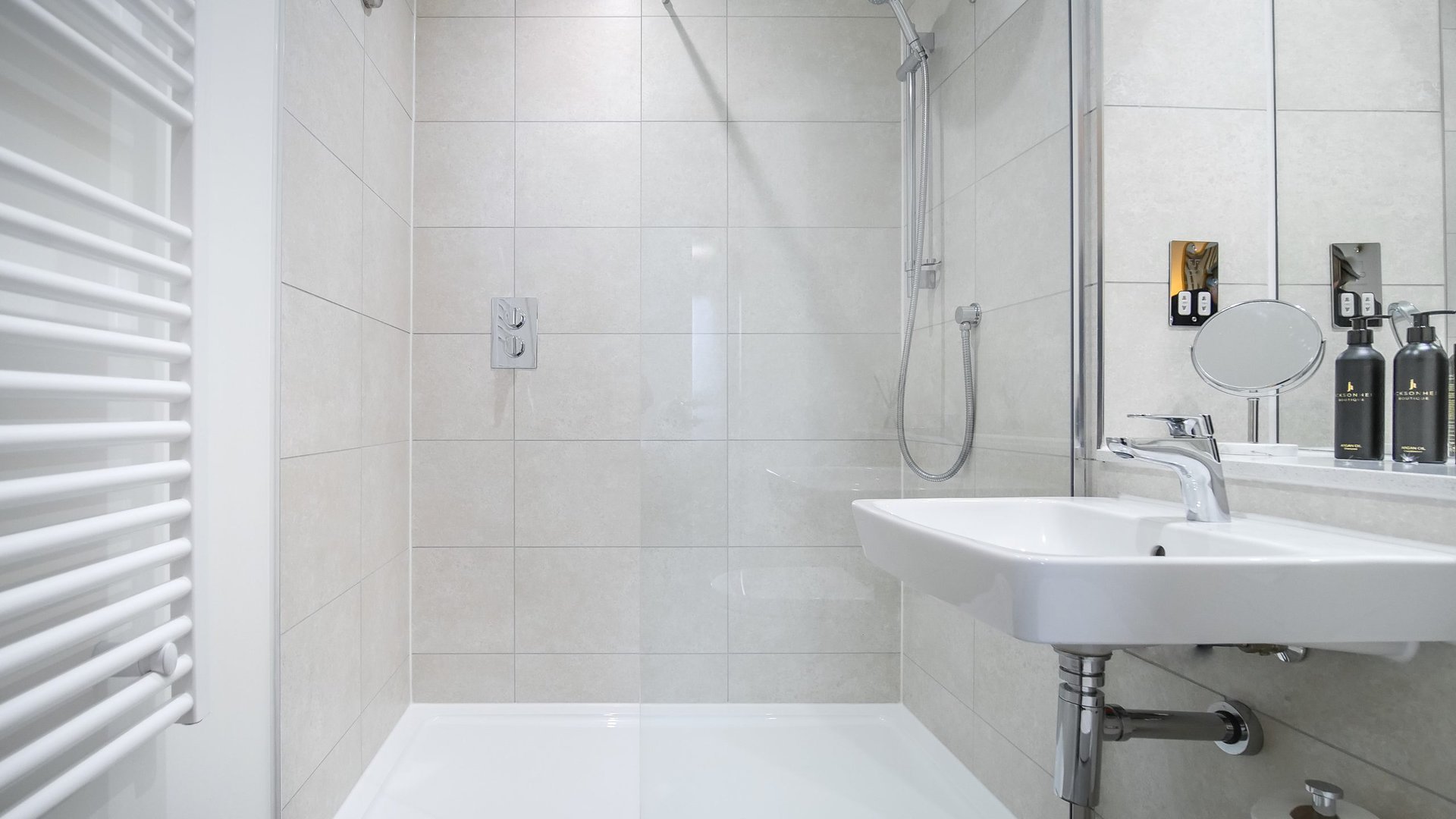 The bathrooms balance simplicity with luxury.Boasting a large walk in shower  in the upstairs en suite and a spacious tub in the downstairs both bathrooms have mirrored cabinets that help bounce light around the rooms.Â